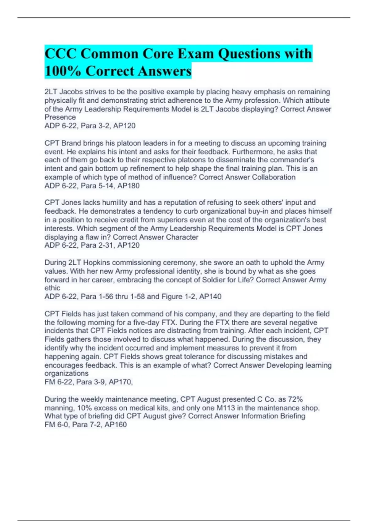 2LT Jacobs strives to be the positive example by placing heavy emphasis on remaining physically fit and demonstrating strict adherence to the Army profession. Which attibute of the Army Leadership Requirements Model is 2LT Jacobs displaying? Correct Answer Presence ADP 6-22, Para 3-2, AP120 CPT Brand brings his platoon leaders in for a meeting to discuss an upcoming training event. He explains his intent and asks for their feedback. Furthermore, he asks that each of them go back to their respective platoons to disseminate the commander's intent and gain bottom up refinement to help shape the final training plan. This is an example of which type of method of influence? Correct Answer Collaboration ADP 6-22, Para 5-14, AP180 CPT Jones lacks humility and has a reputation of refusing to seek others' input and feedback. He demonstrates a tendency to curb organizational buy-in and places himself in a position to receive credit from superiors even at the cost of the organization's best interests. Which segment of the Army Leadership Requirements Model is CPT Jones displaying a flaw in? Correct Answer Character ADP 6-22, Para 2-31, AP120 During 2LT Hopkins commissioning ceremony, she swore an oath to uphold the Army values. With her new Army professional identity, she is bound by what as she goes forward in her career, embracing the concept of Soldier for Life? Correct Answer Army ethic ADP 6-22, Para 1-56 thru 1-58 and Figure 1-2, AP140 CPT Fields has just taken command of his company, and they are departing to the field the following morning for a five-day FTX. During the FTX there are several negative incidents that CPT Fields notices are distracting from training. After each incident, CPT Fields gathers those involved to discuss what happened. During the discussion, they identify why the incident occurred and implement measures to prevent it from happening again. CPT Fields shows great tolerance for discussing mistakes and encourages feedback. This is an example of what? Correct Answer Developing learning organizations FM 6-22, Para 3-9, AP170, During the weekly maintenance meeting, CPT August presented C Co. as 72% manning, 10% excess on medical kits, and only one M113 in the maintenance shop. What type of briefing did CPT August give? Correct Answer Information Briefing FM 6-0, Para 7-2, AP160