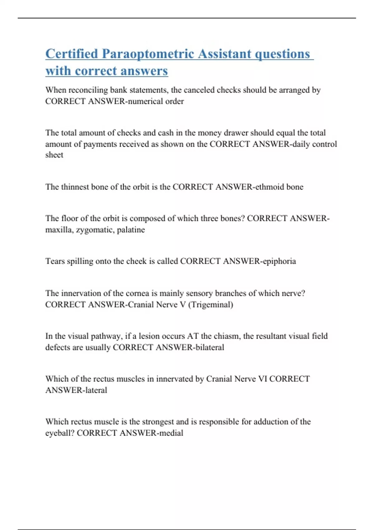 When reconciling bank statements, the canceled checks should be arranged by CORRECT ANSWER-numerical order The total amount of checks and cash in the money drawer should equal the total amount of payments received as shown on the CORRECT ANSWER-daily control sheet The thinnest bone of the orbit is the CORRECT ANSWER-ethmoid bone The floor of the orbit is composed of which three bones? CORRECT ANSWER-maxilla, zygomatic, palatine Tears spilling onto the cheek is called CORRECT ANSWER-epiphoria The innervation of the cornea is mainly sensory branches of which nerve? CORRECT ANSWER-Cranial Nerve V (Trigeminal) In the visual pathway, if a lesion occurs AT the chiasm, the resultant visual field defects are usually CORRECT ANSWER-bilateral Which of the rectus muscles in innervated by Cranial Nerve VI CORRECT ANSWER-lateral Which rectus muscle is the strongest and is responsible for adduction of the eyeball? CORRECT ANSWER-medial