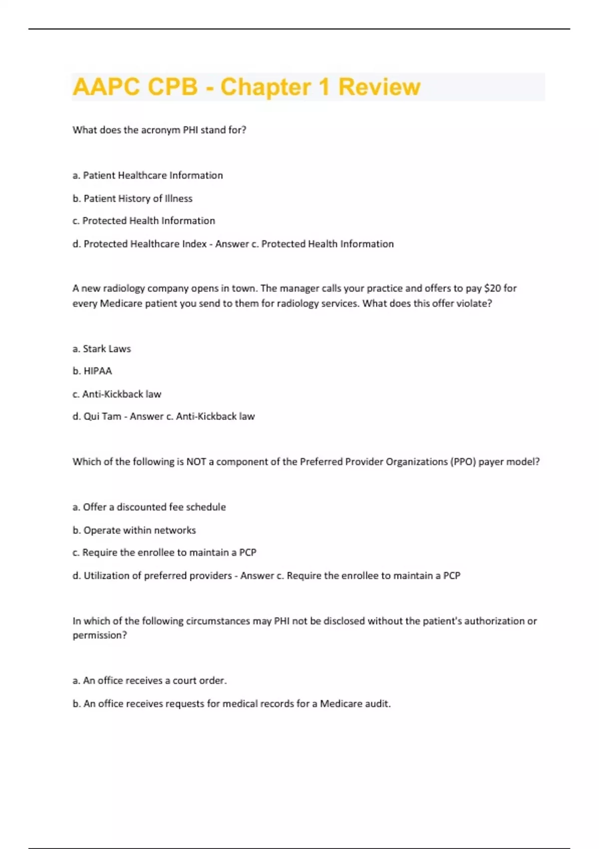 What does the acronym PHI stand for? a. Patient Healthcare Information b. Patient History of Illness c. Protected Health Information d. Protected Healthcare Index - Answer c. Protected Health Information A new radiology company opens in town. The manager calls your practice and offers to pay $20 for every Medicare patient you send to them for radiology services. What does this offer violate? a. Stark Laws b. HIPAA c. Anti-Kickback law d. Qui Tam - Answer c. Anti-Kickback law Which of the following is NOT a component of the Preferred Provider Organizations (PPO) payer model? a. Offer a discounted fee schedule b. Operate within networks c. Require the enrollee to maintain a PCP d. Utilization of preferred providers - Answer c. Require the enrollee to maintain a PCP In which of the following circumstances may PHI not be disclosed without the patient's authorization or permission? a. An office receives a court order. b. An office receives requests for medical records for a Medicare audit.c. An office receives a call from a patient's husband asking for information about his wife's recent office visit. d. An office releases patient information to the Coroner's office upon the death of a patient. - Answer c. An office receives a call from a patient's husband asking for information about his wife's recent office visit. Which of the following is not a covered entity in the Privacy Rule? a. Commercial insurance company b. A healthcare consulting firm c. A Pediatric practice d. A billing service - Answer b. A healthcare consulting firm