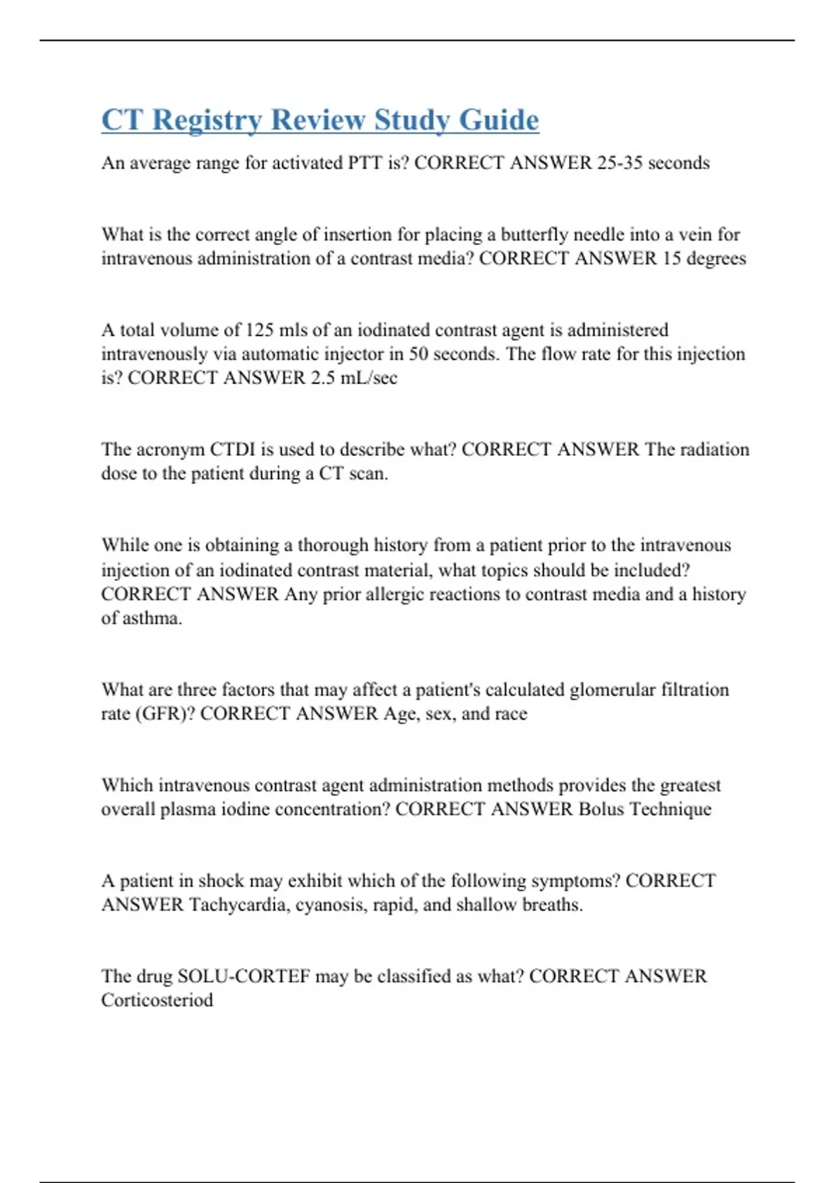 An average range for activated PTT is? CORRECT ANSWER 25-35 seconds What is the correct angle of insertion for placing a butterfly needle into a vein for intravenous administration of a contrast media? CORRECT ANSWER 15 degrees A total volume of 125 mls of an iodinated contrast agent is administered intravenously via automatic injector in 50 seconds. The flow rate for this injection is? CORRECT ANSWER 2.5 mL/sec The acronym CTDI is used to describe what? CORRECT ANSWER The radiation dose to the patient during a CT scan. While one is obtaining a thorough history from a patient prior to the intravenous injection of an iodinated contrast material, what topics should be included? CORRECT ANSWER Any prior allergic reactions to contrast media and a history of asthma. What are three factors that may affect a patient's calculated glomerular filtration rate (GFR)? CORRECT ANSWER Age, sex, and race Which intravenous contrast agent administration methods provides the greatest overall plasma iodine concentration? C