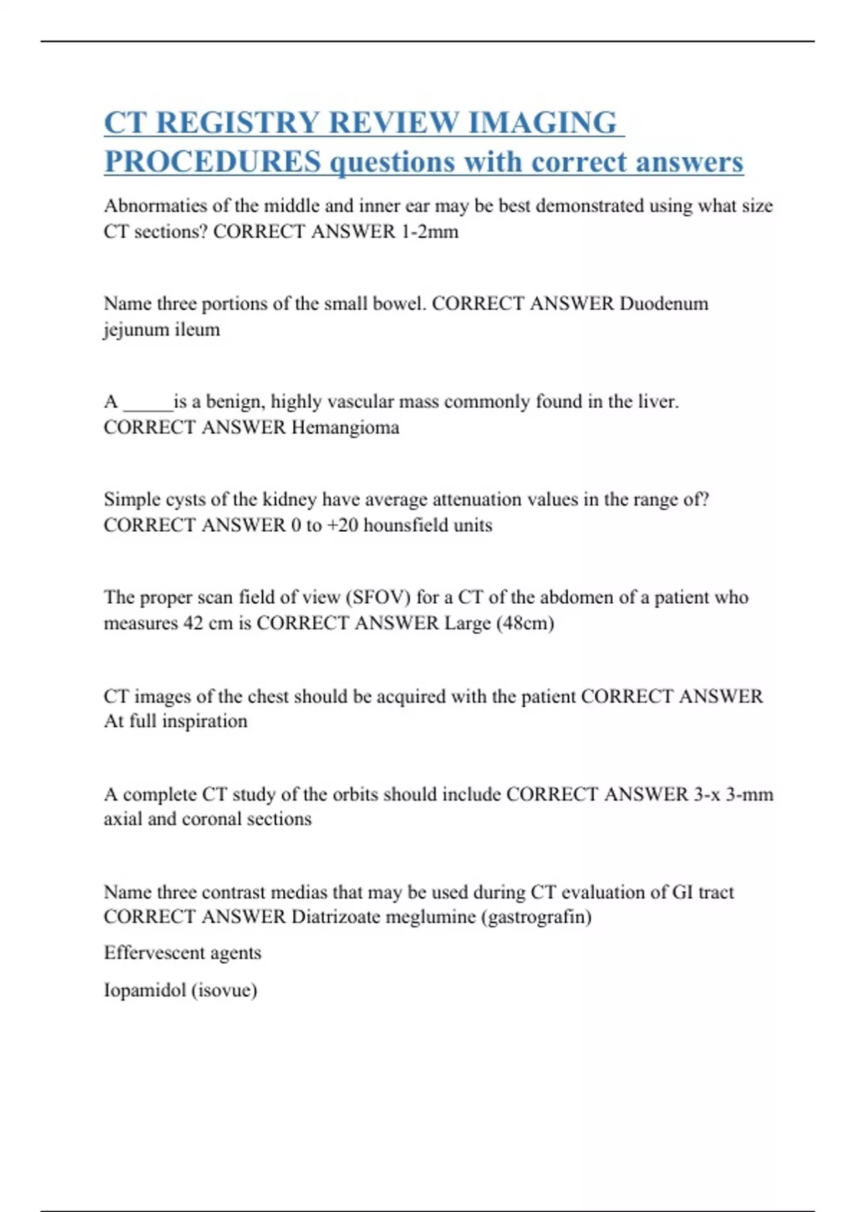 CT REGISTRY REVIEW IMAGING PROCEDURES questions with correct answers