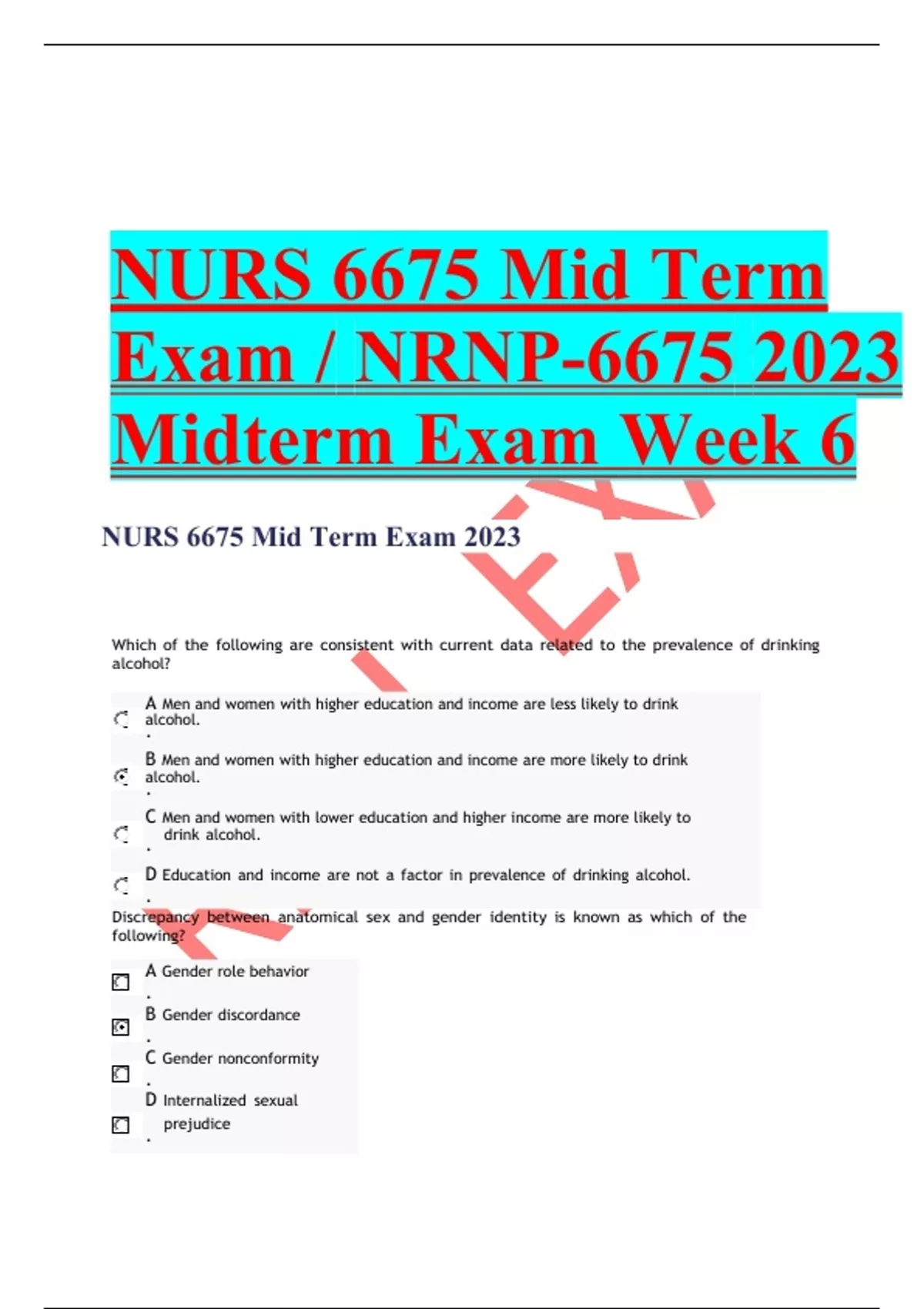NURS 6675 Mid Term Exam / NRNP- Midterm Exam Week 6 NURS 6675 Mid Term Exam 2023 Which of the following are consistent with current data related to the prevalence of drinking alcohol? Discrepancy between anatomical sex and gender identity is known as which of the following?