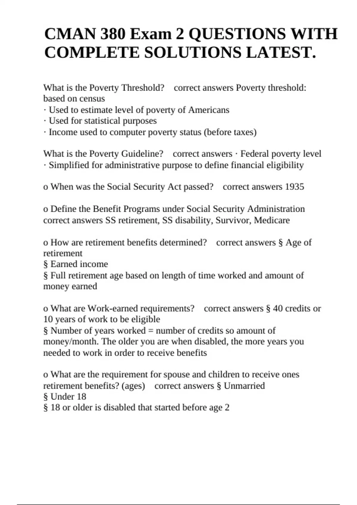 CMAN 380 Exam 2 QUESTIONS WITH COMPLETE SOLUTIONS LATEST. What is the Poverty Threshold? correct answers Poverty threshold: based on census · Used to estimate level of poverty of Americans · Used for statistical purposes · Income used to computer poverty status (before taxes) What is the Poverty Guideline? correct answers · Federal poverty level · Simplified for administrative purpose to define financial eligibility o When was the Social Security Act passed? correct answers 1935 o Define the Benefit Programs under Social Security Administration correct answers SS retirement, SS disability, Survivor, Medicare o How are retirement benefits determined? correct answers § Age of retirement § Earned income § Full retirement age based on length of time worked and amount of money earned o What are Work-earned requirements? correct answers § 40 credits or 10 years of work to be eligible § Number of years worked = number of credits so amount of money/month. The older you are when disabled, the more years you needed to work in order to receive benefits.