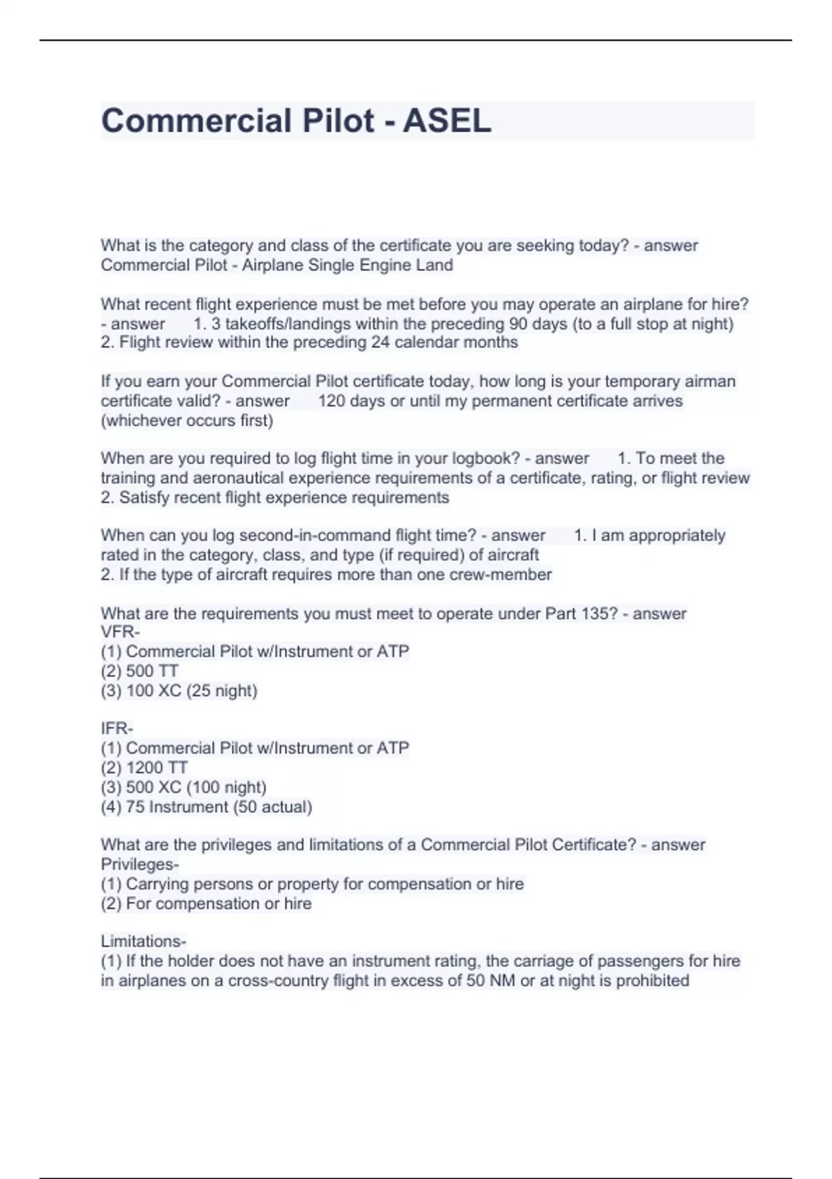 Commercial Pilot - ASEL Questions and Answer Graded A+