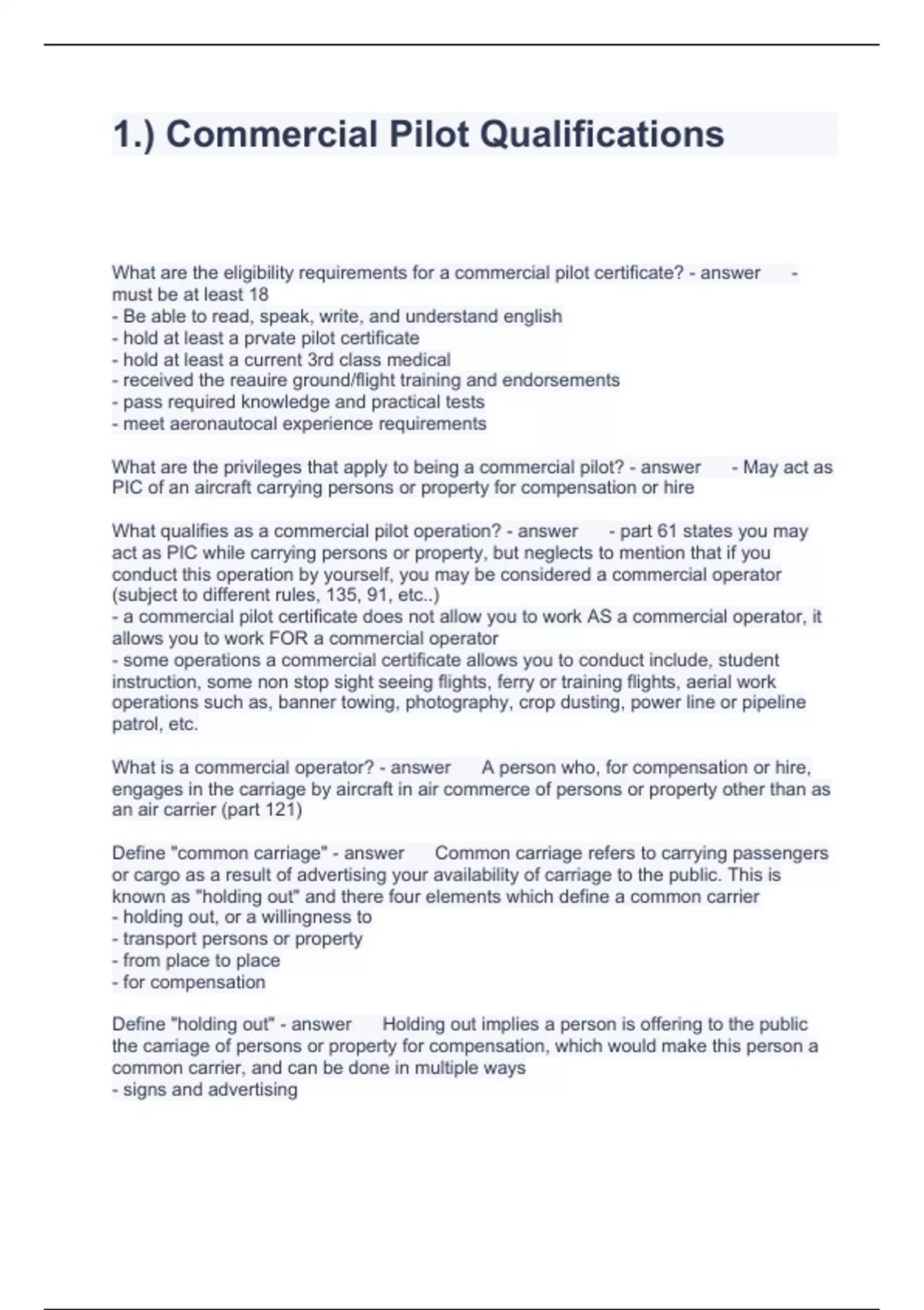 Commercial Pilot Qualifications Questions and Answers 100% correct