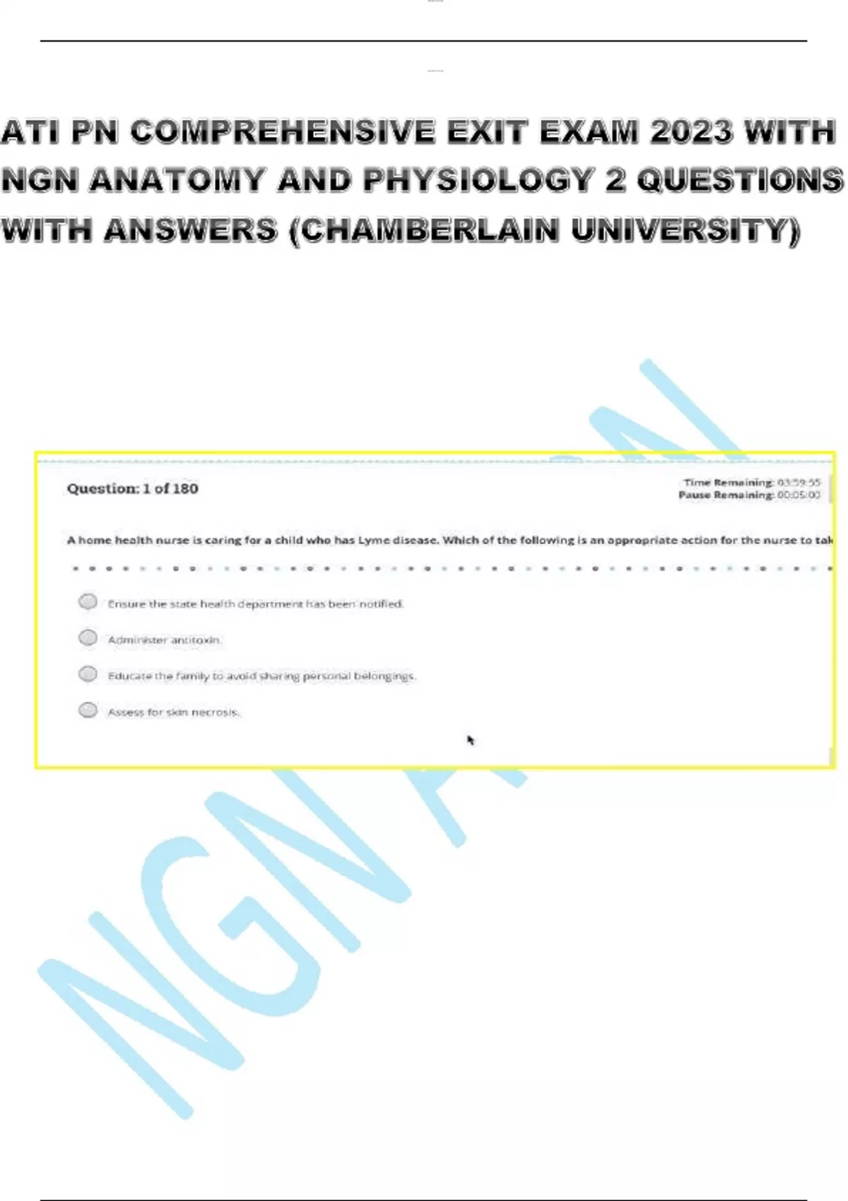 ATI PN COMPREHENSIVE EXIT EXAM 2023 WITH NGN ANATOMY AND PHYSIOLOGY 2 QUESTIONS WITH ANSWERS (CHAMBERLAIN UNIVERSITY) Question: 1of 180 A home health nurse is caring for a child who has Lyme disease. Which of the following is an appropriate action for the nurse to take? – ensure the state health department has been notifed - administer antitoxin - educate the family to avoid sharing personal belongings - assess the skin necrosis