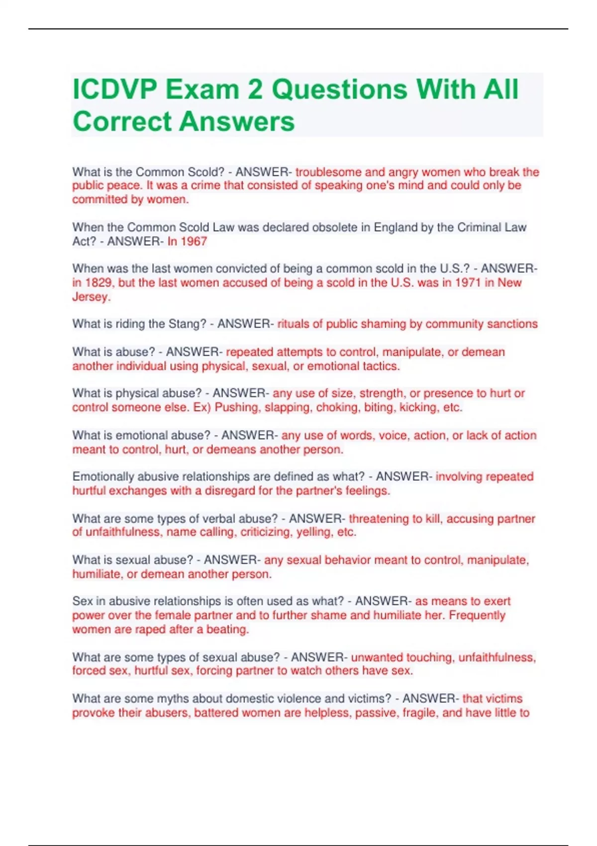 ICDVP Exam 2 Questions With All Correct Answers What is the Common Scold? - ANSWER- troublesome and angry women who break the public peace. It was a crime that consisted of speaking one's mind and could only be committed by women. When the Common Scold Law was declared obsolete in England by the Criminal Law Act? - ANSWER- In 1967 When was the last women convicted of being a common scold in the U.S.? - ANSWERin 1829, but the last women accused of being a scold in the U.S. was in 1971 in New Jersey. What is riding the Stang? - ANSWER- rituals of public shaming by community sanctions What is abuse? - ANSWER- repeated attempts to control, manipulate, or demean another individual using physical, sexual, or emotional tactics. What is physical abuse? - ANSWER- any use of size, strength, or presence to hurt or control someone else. Ex) Pushing, slapping, choking, biting, kicking, etc. What is emotional abuse? - ANSWER- any use of words, voice, action, or lack of action meant to control, hurt, or demeans another person. Emotionally abusive relationships are defined as what? - ANSWER- involving repeated hurtful exchanges with a disregard for the partner's feelings. What are some types of verbal abuse? - ANSWER- threatening to kill, accusing partner of unfaithfulness, name calling, criticizing, yelling, etc. What is sexual abuse? - ANSWER- any sexual behavior meant to control, manipulate, humiliate, or demean another person. Sex in abusive relationships is often used as what? - ANSWER- as means to exert power over the female partner and to further shame and humiliate her. Frequently women are raped after a beating. What are some types of sexual abuse? - ANSWER- unwanted touching, unfaithfulness, forced sex, hurtful sex, forcing partner to watch others have sex. What are some myths about domestic violence and victims? - ANSWER- that victims provoke their abusers, battered women are helpless, passive, fragile, and have little to no education, battered women enjoy abuse, batterers are inappropriate in all their relationships, abusive relationships will not change for the better, and alcohol and drug use cause battering What are some realities of domestic violence? - ANSWER- Batterers chose to be violent instead of choosing a nonviolent alternative, domestic violence crosses all socioeconomic, ethnic, racial, educational, and religious lines, victim blaming is another way taking the blame away the batterer, the victim cannot control the batterer, batterers choose to act violently in select relationships as a means of dominating What does the feminist theory propose the cause of domestic violence is? - ANSWERThe theory suggests that economic, social, and historical processes operate both directly and indirectly to support male dominated (patriarchal) social order and the family structure itself. Patriarchy has led to the subordination of women and domestic violence is a way of maintaining this subordination. What is the "choice theory"? - ANSWER- this theory states that men abuse women because they can or choose too. They choose to behave abusively toward their female partners because they can get away with it and because doing so gets them what they want. What are the effects of domestic violence on victims? - ANSWER- lowered self-esteem, accepting responsibility for the partners actions, guilt, feelings of helplessness that affect how the women think, feel, and act. Also they may be in denial which is used as a survival strategy. What are some the defense mechanisms a batterer may use to justify the abuse? - ANSWER- Rationalization ("I just wanted her to listen to me") Denial/minimizing ("I only pushed her") Denial/claiming loss of control ("A man can only take so much") Blaming ("If she hadn't provoked me...") What happens in the tension building phase? - ANSWER- less lethal forms of battering occur, the women senses the tension and tries to make the abusive partner less angry to prevent abuse, the woman minimizes the minor incidents and blames herself, the women denies that the tension will escalate What happens in the acute battering phase? - ANSWER- the abuser's rage escalates dramatically, both the abuser and woman accept the myth that he can't control his anger, severe injuries occur as a result of the battering, women experiences shock and disbelief that the incident has occurred What happens in the honeymoon phase? - ANSWER- the abuser expresses remorse for his behavior and makes promises to change, abuser is charming and loving, offers gifts to apologize, begins to show feelings of guilt and sympathy for woman, the woman's desire to believe he will change and the abuser's temporarily changed behavior reinforce her desire to stay in the relationship What is the Victim's Economic Security and Safety Act? - ANSWER- it allows employees who are victims of domestic or sexual violence or who have family or household members who are victims of such violence to take up to 12 weeks of unpaid leave per any 12 month period to seek medical help, legal assistance, counseling, safety planning, and other assistance. The Act also prohibits employers from discriminating against employees who are victims of domestic or sexual violence or who have family or household members who are victims of domestic or sexual violence. What is the Safe Homes Act? - ANSWER- It allows victims of domestic or sexual violence to leave their rental housing early, before the end of their lease, to protect their physical safety and emotional wellbeing. In certain circumstances, victims can also request an emergency lock change to keep the abuser out of the home. How do you clean up a blood spill? - ANSWER- 1 part bleach and 10 parts water. 20 min stand time Under the 1994 Violence against Women Act (VAWA) it's illegal for individuals who have been convicted of a domestic violence related incident or who have an order of protection against them to what? - ANSWER- to possess a fire arm. Military and law enforcement personnel are NOT e