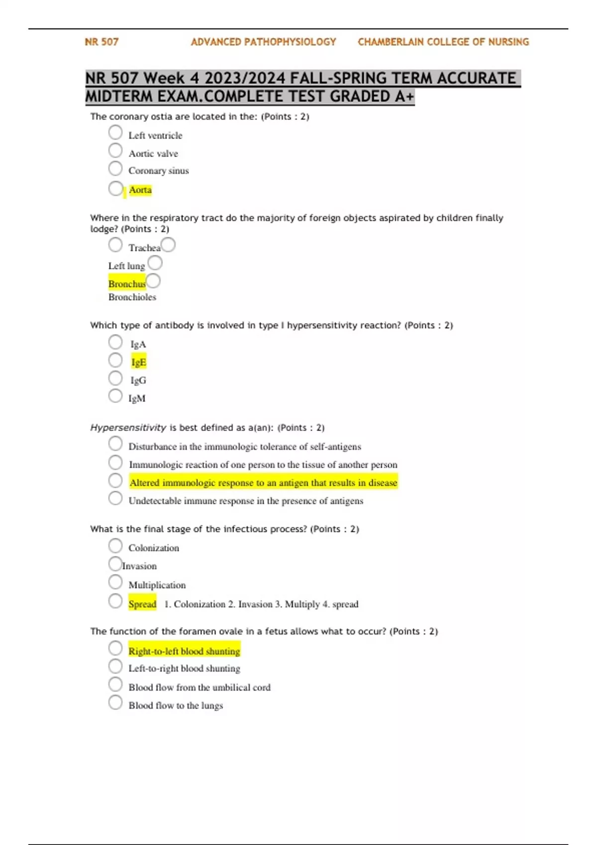 NR 507 Week 4 2023/2024 FALL-SPRING TERM ACCURATE MIDTERM EXAM.COMPLETE TEST GRADED A+ The coronary ostia are located in the: (Points : 2) Left ventricle Aortic valve Coronary sinus Aorta Where in the respiratory tract do the majority of foreign objects aspirated by children finally lodge? (Points : 2) Trachea Left lung Bronchus Bronchioles Which type of antibody is involved in type I hypersensitivity reaction? (Points : 2) IgA IgE IgG IgM Hypersensitivity is best defined as a(an): (Points : 2) Disturbance in the immunologic tolerance of selfantigens Immunologic reaction of one person to the tissue of another person Altered immunologic response to an antigen that results in disease Undetectable immune response in the presence of antigens What is the final stage of the infectious process? (Points : 2) Colonization Invasion Multiplication Spread 1. Colonization 2. Invasion 3. Multiply 4. spread The function of the foramen ovale in a fetus allows what to occur? (Points : 2) Righttoleft blood shunting Lefttoright blood shunting Blood flow from the umbilical cord Blood flow to the lungs