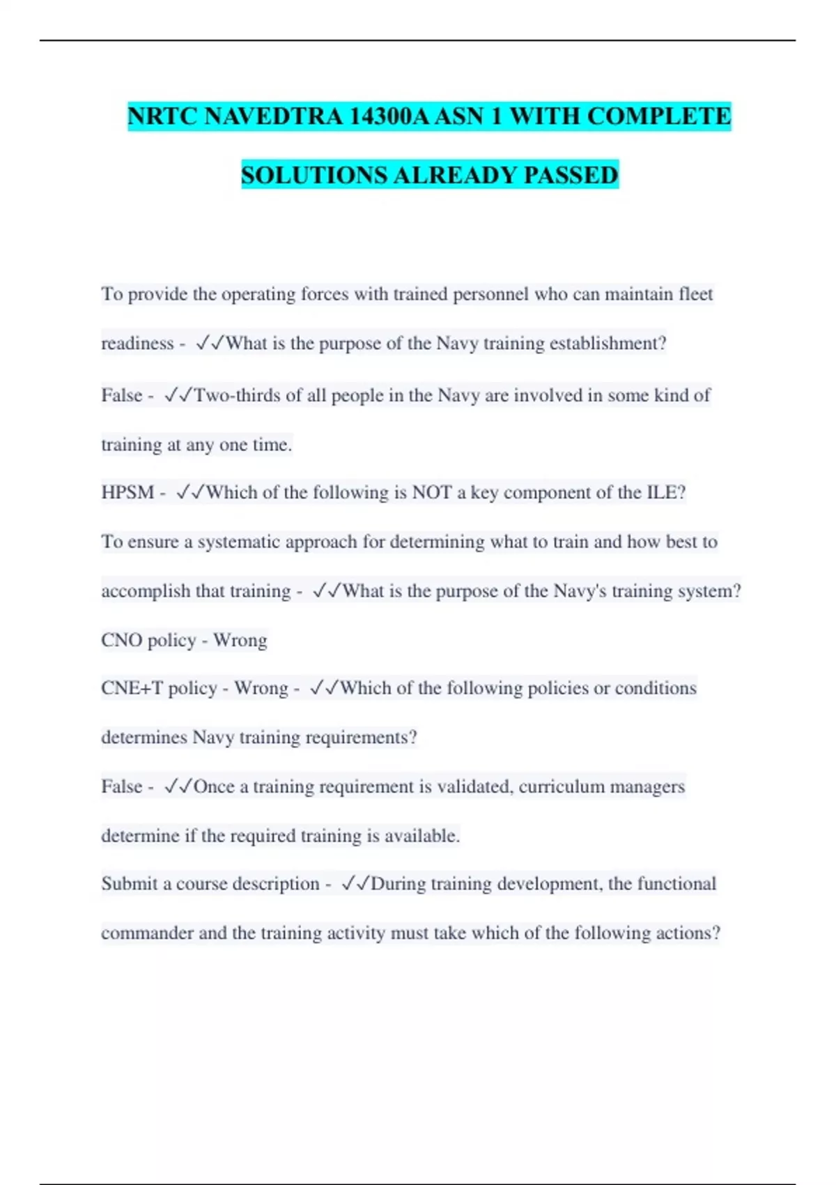 NRTC NAVEDTRA 14300A ASN 1 WITH COMPLETE SOLUTIONS ALREADY PASSED To provide the operating forces with trained personnel who can maintain fleet readiness - What is the purpose of the Navy training establishment? False - Two-thirds of all people in the Navy are involved in some kind of training at any one time. HPSM - Which of the following is NOT a key component of the ILE? To ensure a systematic approach for determining what to train and how best to accomplish that training - What is the purpose of the Navy's training system? CNO policy - Wrong CNE+T policy - Wrong - Which of the following policies or conditions determines Navy training requirements? False - Once a training requirement is validated, curriculum managers determine if the required training is available. Submit a course description - During training development, the functional commander and the training activity must take which of the following actions?