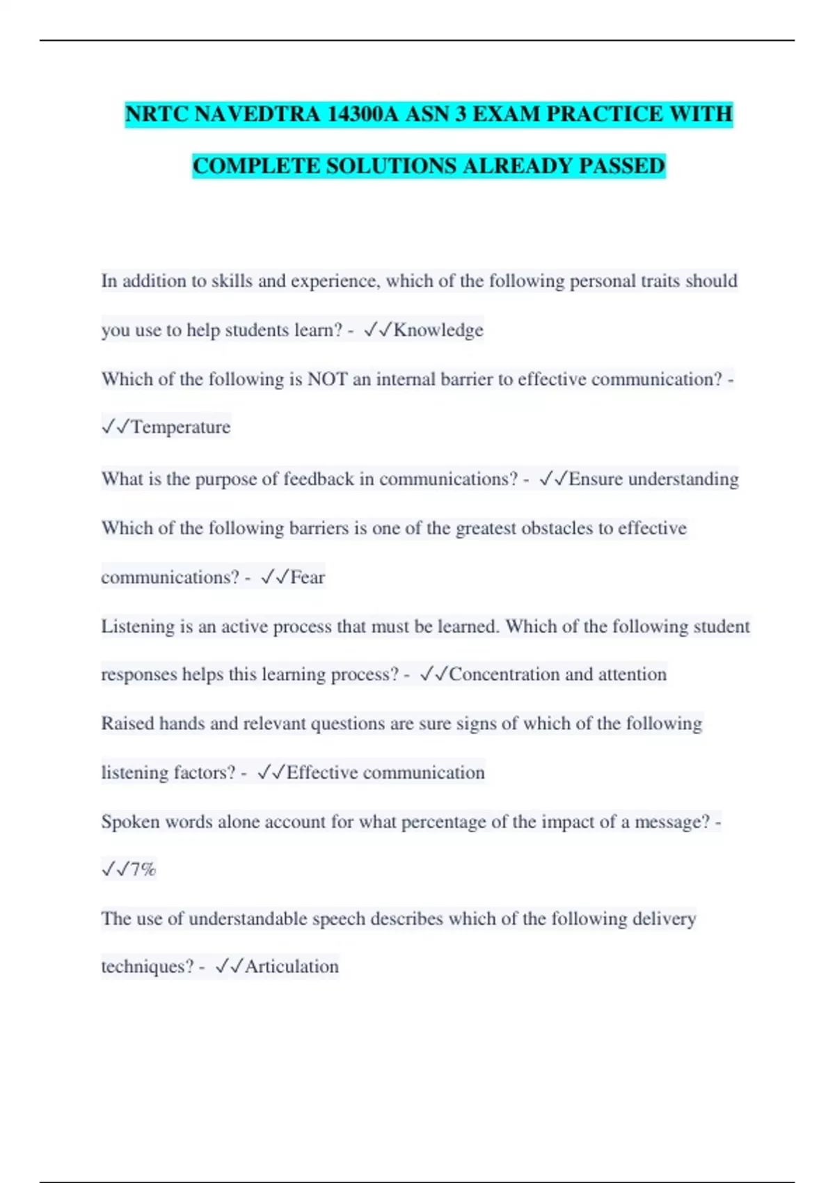 NRTC NAVEDTRA 14300A ASN 3 EXAM PRACTICE WITH COMPLETE SOLUTIONS ALREADY PASSED In addition to skills and experience, which of the following personal traits should you use to help students learn? - Knowledge Which of the following is NOT an internal barrier to effective communication? - Temperature What is the purpose of feedback in communications? - Ensure understanding Which of the following barriers is one of the greatest obstacles to effective communications? - Fear Listening is an active process that must be learned. Which of the following student responses helps this learning process? - Concentration and attention Raised hands and relevant questions are sure signs of which of the following listening factors? - Effective communication Spoken words alone account for what percentage of the impact of a message? - 7% The use of understandable speech describes which of the following delivery techniques? - Articulation