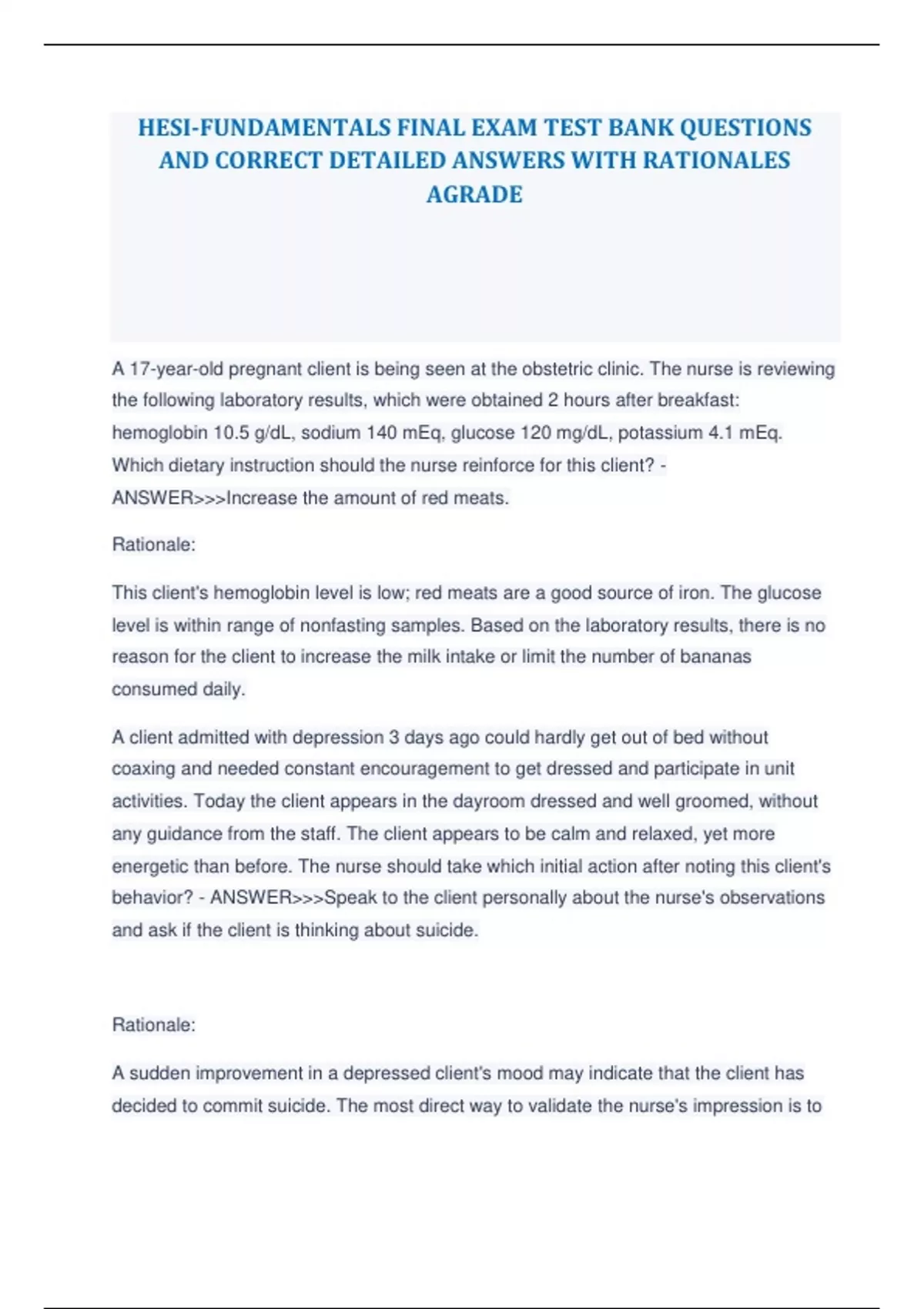 HESI-FUNDAMENTALS FINAL EXAM TEST BANK QUESTIONS AND CORRECT DETAILED ANSWERS WITH RATIONALES AGRADE