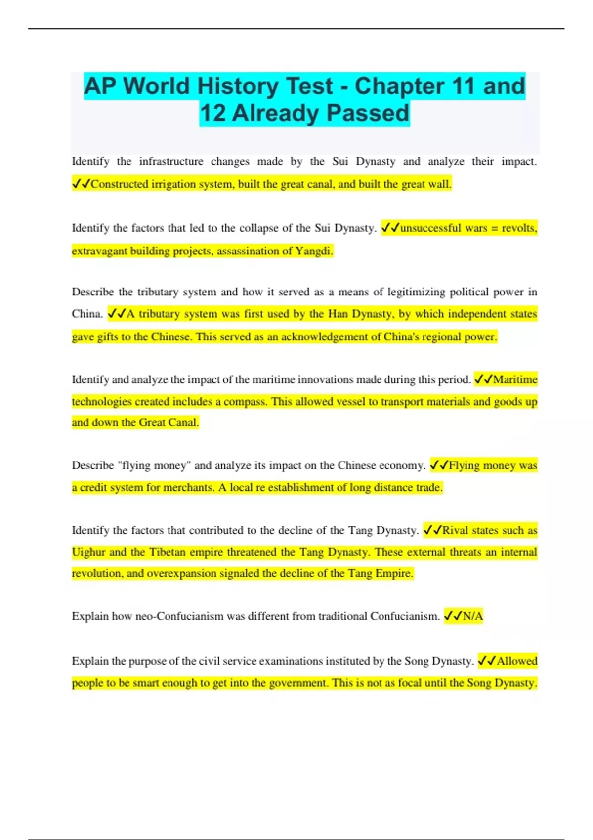 Identify the infrastructure changes made by the Sui Dynasty and analyze their impact. Constructed irrigation system, built the great canal, and built the great wall. Identify the factors that led to the collapse of the Sui Dynasty. unsuccessful wars = revolts, extravagant building projects, assassination of Yangdi. Describe the tributary system and how it served as a means of legitimizing political power in China. A tributary system was first used by the Han Dynasty, by which independent states gave gifts to the Chinese. This served as an acknowledgement of China's regional power. Identify and analyze the impact of the maritime innovations made during this period. Maritime technologies created includes a compass. This allowed vessel to transport materials and goods up and down the Great Canal. Describe "flying money" and analyze its impact on the Chinese economy. Flying money was a credit system for merchants. A local re establishment of long distance trade. Identify the factors that contributed to the decline of the Tang Dynasty. Rival states such as Uighur and the Tibetan empire threatened the Tang Dynasty. These external threats an internal revolution, and overexpansion signaled the decline of the Tang Empire. Explain how neo-Confucianism was different from traditional Confucianism. N/A Explain the purpose of the civil service examinations instituted by the Song Dynasty. Allowed people to be smart enough to get into the government. This is not as focal until the Song Dynasty.