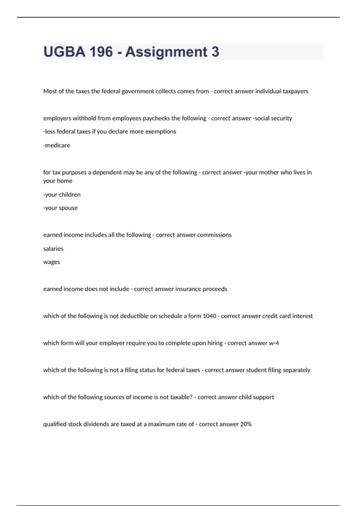 UGBA 196 - Assignment 3Most of the taxes the federal government collects comes from - correct answer individual taxpayers employers withhold from employees paychecks the following - correct answer -social security -less federal taxes if you declare more exemptions -medicare for tax purposes a dependent may be any of the following - correct answer -your mother who lives in your home -your children -your spouse earned income includes all the following - correct answer commissions salaries wages earned income does not include - correct answer insurance proceeds which of the following is not deductible on schedule a form 1040 - correct answer credit card interest which form will your employer require you to complete upon hiring - correct answer w-4 which of the following is not a filing status for federal taxes - correct answer student filing separately which of the following sources of income is not taxable? - correct answer child support qualified stock dividends are taxed at a maximum rate of - correct answer 20% non-qualified dividends are taxed at a maximum rate of - correct answer 39.6% interest is taxed at a maximum rate of - correct answer 39.6% short term capital gains are taxed at a maximum rate of - correct answer 39.6% long term capital gains are taxed at a maximum rate of - correct answer 20% losses in excess of gains in any one year can be used to reduce taxable income up to - correct answer $3000 adjusted gross income is what you get after subtracting from total income, specific deductions except - correct answer charitable deductions if you have $14000 of short term capital gains and $7500 of short term capital losses in the same year how much will be taxable to you? - correct answer $6,500 the wash sale rule is designed to - correct answer disallow certain losses in the trading of securities if you buy 200 shares of stock in a taxable account for $22,500 on oct 1st, sell them for $18,000 on oct 12, and buy back 200 shares of the same stock on oct 28 for $19,000 what would be your reportable tax loss - correct answer nothing when itemizing tax deduction - correct answer -total deductions may be reduced for high income earners -proof may be required by IRS -itemize your total deductions if they exceed standard deduction common tax credits - correct answer are worth more than tax deductions