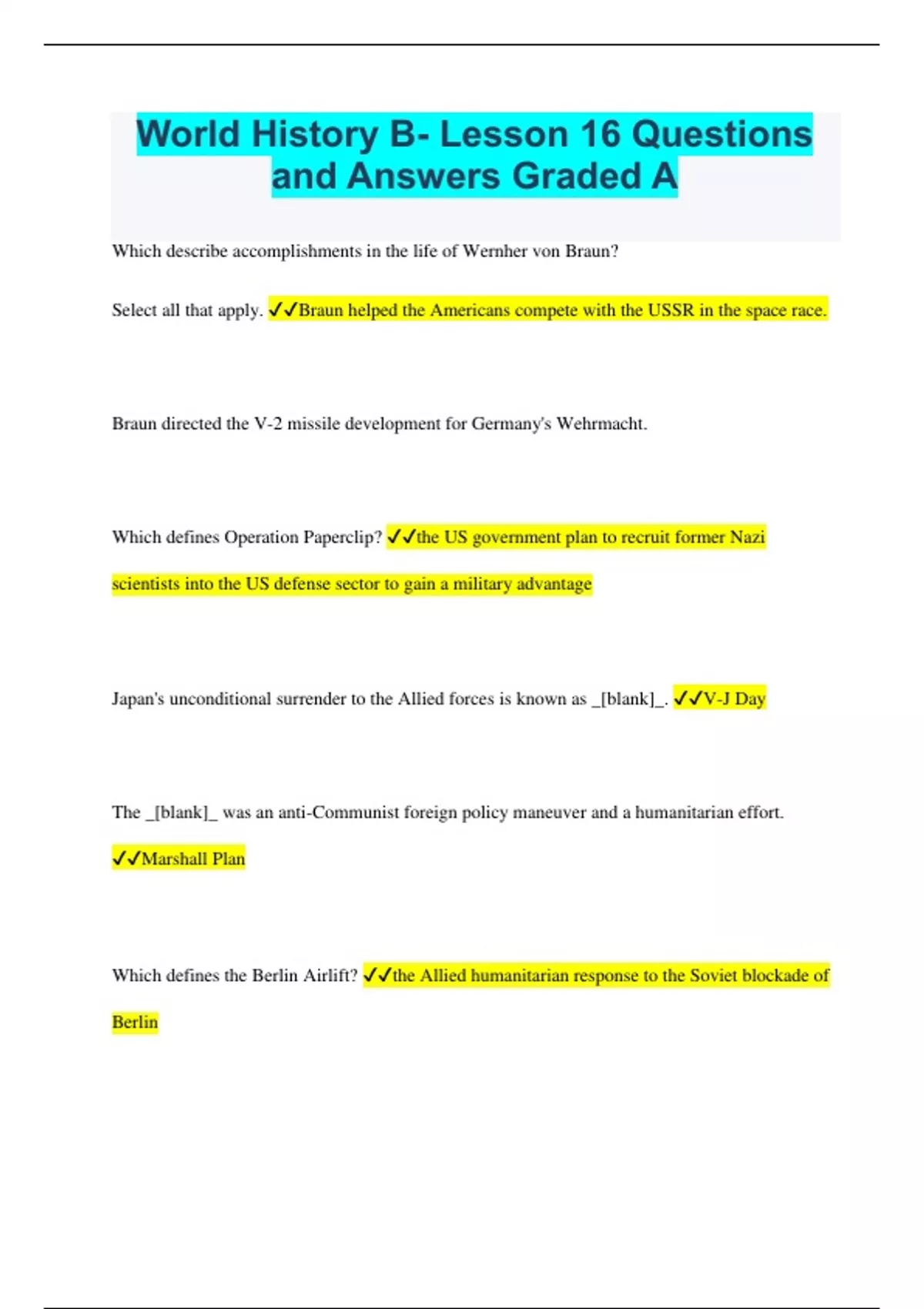 World History B- Lesson 16 Questions and Answers Graded A Which describe accomplishments in the life of Wernher von Braun? Select all that apply. Braun helped the Americans compete with the USSR in the space race. Braun directed the V-2 missile development for Germany's Wehrmacht. Which defines Operation Paperclip? the US government plan to recruit former Nazi scientists into the US defense sector to gain a military advantage Japan's unconditional surrender to the Allied forces is known as _[blank]_. V-J Day The _[blank]_ was an anti-Communist foreign policy maneuver and a humanitarian effort. Marshall Plan Which defines the Berlin Airlift? the Allied humanitarian response to the Soviet blockade of Berlin What was the Truman Doctrine? an American policy to stop the expansion of Communism across the globe _[blank]_ is the belief that if one country turned to Communism, then the surrounding countries would also turn to Communism. Domino theory Which identifies Chiang Kai-shek? leader of the Chinese Nationalists defeated by the forces of the Chinese Communist Party What effect did the reconstructing of Germany have? Investing in the business sectors led to a significant boost of the German economy. Who was Mao Zedong? leader of the Chinese Communist Party who guided the Communist faction to victory over the Chinese Nationalist Party Which describes the United States efforts to rebuild Japan after World War II? It was a three-phase operation to end Japanese military rule and rebuild Japan's economy. How was the Marshall Plan designed to restore Europe in ways that discouraged the advance of Communism in Eastern Europe? Select all that apply. It included measures to revive bombed-out agricultural areas, helping reverse a postwar famine and earning the support of starving Europeans. It modernized industries and enacted recovery plans to build regional self-reliance and economic strength to resist Soviet aid. Which option suggests the wide-ranging influence of the refugee Nazi scientists on US technology? These scientists designed missiles, but they also worked toward future applications of rocket science. What events led to the decline of the Chinese Nationalists? Japan renewed its invasion of China, weakening the Chinese Nationalists while the Communist Party gained strength by radicalizing the peasant class. How did Kennan's Long Telegram shape the United States interaction with Communism throughout the world? The United States sought to restrict the expansion of Communism and Soviet influence. What was George C. Marshall's role in the Allied effort during World War II? He led the Allied forces to victory and then guided them in rebuilding war-torn Europe, ensuring a lasting peace. Which identifies the effects of the Truman Doctrine? The doctrine prevented the spread of Communism into third-world countries by issuing monetary aid.