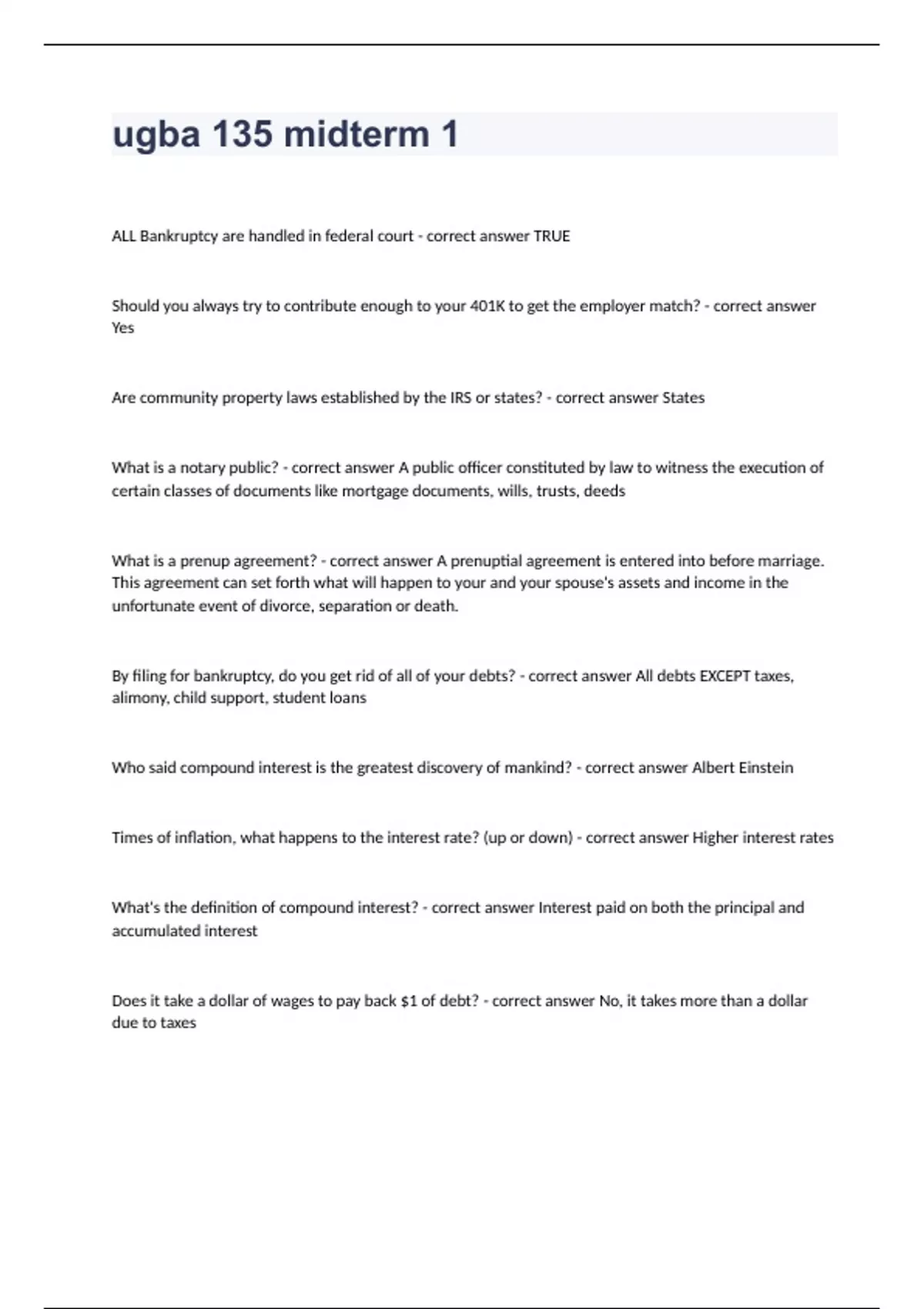 ugba 135 midterm 1ALL Bankruptcy are handled in federal court - correct answer TRUE Should you always try to contribute enough to your 401K to get the employer match? - correct answer Yes Are community property laws established by the IRS or states? - correct answer States What is a notary public? - correct answer A public officer constituted by law to witness the execution of certain classes of documents like mortgage documents, wills, trusts, deeds What is a prenup agreement? - correct answer A prenuptial agreement is entered into before marriage. This agreement can set forth what will happen to your and your spouse's assets and income in the unfortunate event of divorce, separation or death. By filing for bankruptcy, do you get rid of all of your debts? - correct answer All debts EXCEPT taxes, alimony, child support, student loans Who said compound interest is the greatest discovery of mankind? - correct answer Albert Einstein Times of inflation, what happens to the interest rate? (up or down) - correct answer Higher interest rates What's the definition of compound interest? - correct answer Interest paid on both the principal and accumulated interest Does it take a dollar of wages to pay back $1 of debt? - correct answer No, it takes more than a dollar due to taxes What is the concept of the time value of money? - correct answer Money is worth different amounts at different times What is the biggest reason to start saving ASAP? - correct answer Compounding interest As people get closer to retirement, how should they adjust their portfolio? - correct answer Adjust portfolio to be less risky, more bonds less stocks What is APR? Is that higher than the annual interest rate? - correct answer Annual Percentage Rate, higher than the interest rate because APR includes fees According to the nightingale survey, What % of the people who people who start working at 25 become financial independence by 65? - correct answer 5% What types of accounts does the FDIC insure up to $250,000 - correct answer CD, checking accounts, savings accounts, IRA (Individual Retirement Accounts) and certain other retirement and trust accounts Everytime you get a paycheck, our goal is to save what percent? - correct answer 15% of total income The RULE OF FRED!!!!!!!!!!!! - correct answer I GET PAID FIRST What's the first step in saving money? - correct answer Creating a budget or spending plan What's our definition of being frugal? - correct answer Not cheap but value oriented, working toward their goals, budgeting, and controlling expenses What is the rule of 72? - correct answer Estimate how long it takes a sum of money to double, 72/interest rate If you have different types of debt, which is your first priority? (CC) - correct answer Pay off the loan with the highest interest