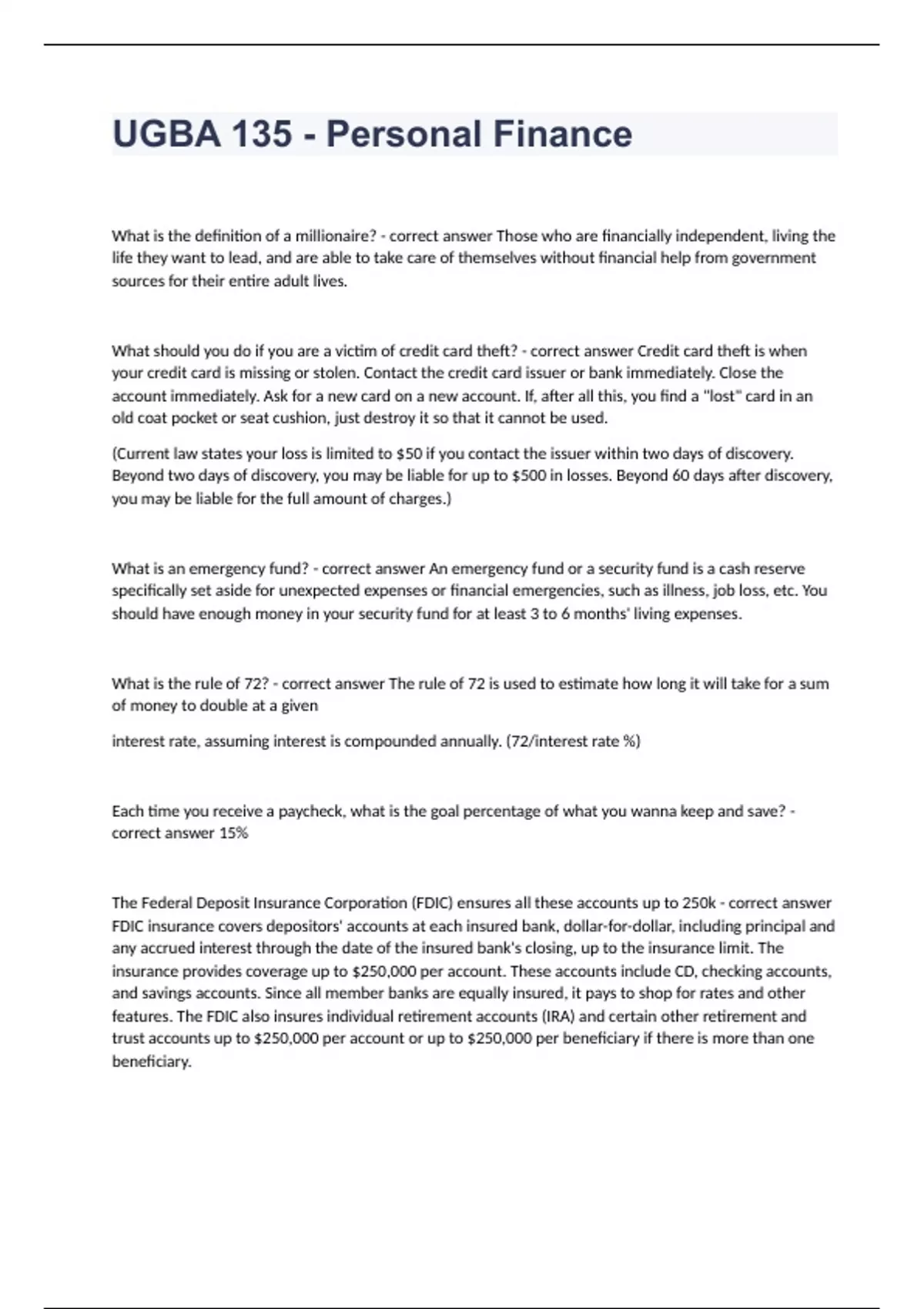 UGBA 135 - Personal Finance What is the definition of a millionaire? - correct answer Those who are financially independent, living the life they want to lead, and are able to take care of themselves without financial help from government sources for their entire adult lives. What should you do if you are a victim of credit card theft? - correct answer Credit card theft is when your credit card is missing or stolen. Contact the credit card issuer or bank immediately. Close the account immediately. Ask for a new card on a new account. If, after all this, you find a "lost" card in an old coat pocket or seat cushion, just destroy it so that it cannot be used. (Current law states your loss is limited to $50 if you contact the issuer within two days of discovery. Beyond two days of discovery, you may be liable for up to $500 in losses. Beyond 60 days after discovery, you may be liable for the full amount of charges.) What is an emergency fund? - correct answer An emergency fund or a security fund is a cash reserve specifically set aside for unexpected expenses or financial emergencies, such as illness, job loss, etc. You should have enough money in your security fund for at least 3 to 6 months' living expenses. What is the rule of 72? - correct answer The rule of 72 is used to estimate how long it will take for a sum of money to double at a given interest rate, assuming interest is compounded annually. (72/interest rate %) Each time you receive a paycheck, what is the goal percentage of what you wanna keep and save? - correct answer 15% The Federal Deposit Insurance Corporation (FDIC) ensures all these accounts up to 250k - correct answer FDIC insurance covers depositors' accounts at each insured bank, dollar-for-dollar, including principal and any accrued interest through the date of the insured bank's closing, up to the insurance limit. The insurance provides coverage up to $250,000 per account. These accounts include CD, checking accounts, and savings accounts. Since all member banks are equally insured, it pays to shop for rates and other features. The FDIC also insures individual retirement accounts (IRA) and certain other retirement and trust accounts up to $250,000 per account or up to $250,000 per beneficiary if there is more than one beneficiary. FDIC insurance covers all types of deposits received at an insured bank but does not cover investments, even if they were purchased at an insured bank. This includes checking accounts, negotiable order of withdrawal (NOW) accounts, savings accounts, money market deposit accounts (MMDA), time deposits such as certificates of deposit (CDs) and cashier's checks, money o What doesn't the Federal Deposit Insurance Corporation (FDIC) cover? - correct answer Investments/unearned income (passive income/money that works for itself). Stock and bond investments, mutual funds, crypto assets, life insurance policies, annuities, municipal securities, safe deposit boxes or their contents, U.S. Treasury bills, bonds or notes. What is the meaning of being frugal? - correct answer Living within your means. (T/F) Do banks and credit unions have different requirements? How? - correct answer True. The key difference between banks and credit unions is that banks are for-profit institutions that provide profits to their shareholders while credit unions are run by their members. Since credit unions are member-driven and not for profit, members receive higher interest rates on savings, lower rates on loans and lower fees. According to the Nightingale Survey, what percent is financially independent? - correct answer 4% are financially independent What is a spending plan? - correct answer A spending plan is a method for distributing your income among the mix of things you want and need. Creating a spending plan ahead of time will allow you to effectively manage your finances and determine where to best spend your money. 1. "I Get Paid First" 2. Live off of your earned income, unearned income gets reinvested 3. Frugality = live withing your means 4. Manage your money and you credit score 5. Invest your savings 6. Save at least 15% of your earned income What is the biggest reason to start saving early? - correct answer Compound interest investing early in retirement.