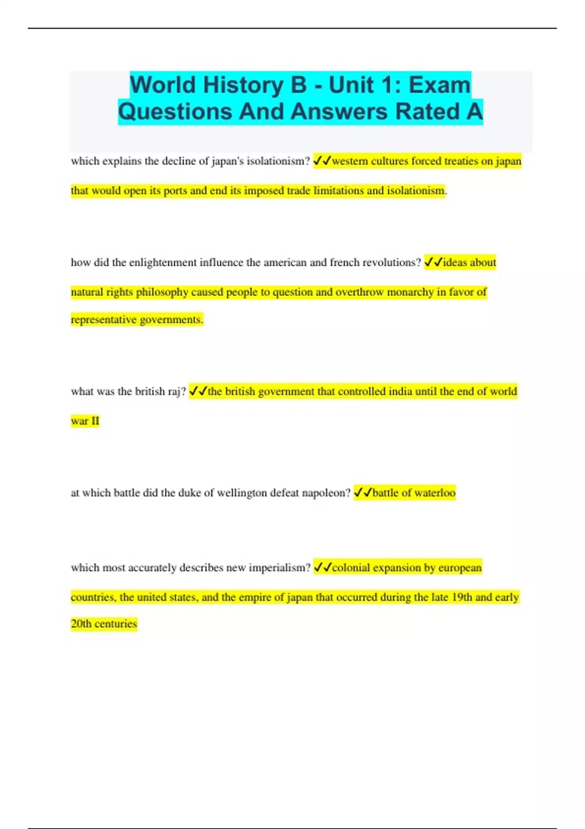 World History B - Unit 1: Exam Questions And Answers Rated A