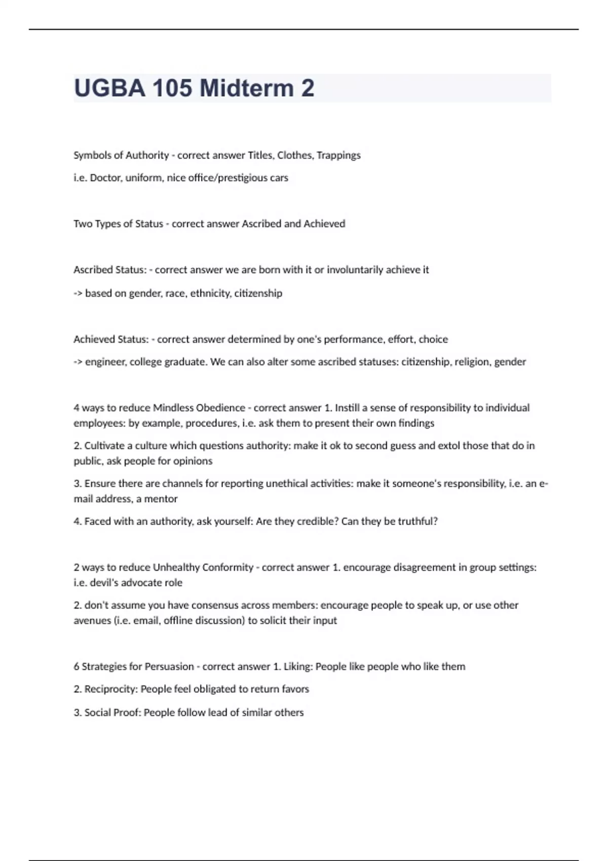UGBA 105 Midterm 2Symbols of Authority - correct answer Titles, Clothes, Trappings i.e. Doctor, uniform, nice office/prestigious cars Two Types of Status - correct answer Ascribed and Achieved Ascribed Status: - correct answer we are born with it or involuntarily achieve it -> based on gender, race, ethnicity, citizenship Achieved Status: - correct answer determined by one's performance, effort, choice -> engineer, college graduate. We can also alter some ascribed statuses: citizenship, religion, gender 4 ways to reduce Mindless Obedience - correct answer 1. Instill a sense of responsibility to individual employees: by example, procedures, i.e. ask them to present their own findings 2. Cultivate a culture which questions authority: make it ok to second guess and extol those that do in public, ask people for opinions 3. Ensure there are channels for reporting unethical activities: make it someone's responsibility, i.e. an e-mail address, a mentor 4. Faced with an authority, ask yourself: Are they credible? Can they be truthful? 2 ways to reduce Unhealthy Conformity - correct answer 1. encourage disagreement in group settings: i.e. devil's advocate role 2. don't assume you have consensus across members: encourage people to speak up, or use other avenues (i.e. email, offline discussion) to solicit their input 6 Strategies for Persuasion - correct answer 1. Liking: People like people who like them 2. Reciprocity: People feel obligated to return favors 3. Social Proof: People follow lead of similar others 4. Consistency: People try to do what they say they will 5. Authority: People defer to experts 6. Scarcity: People want more of what is difficult to get HONESTY IS VERY IMPORTANT Liking - correct answer -people like those that like them -similarity increases liking: physical similarity or similar interests -flattery increases liking: praise "charms and disarms", doesnt have to be merited but that's risky HOW TO DO IT: uncover real similarities and offer genuine praise What is liking - correct answer we comply more with requests from people we like (and who seem to like us) examples of Liking - correct answer salesperson finding common ground; attractive models/political candidates factors of liking - correct answer similarity; ingratiation; attractiveness defense against Liking - correct answer check how quickly liking emerges; separate liking from agreeing Reciprocity - correct answer -people feel obligated to return favors -offering something upfront encourages others to respond to your future requests: gifts for co-workers and subordinates; favors and offers for help -suggests a sense of trust & sense of cooperation HOW TO DO IT: do favors, offer to help, give gifts What is reciprocity - correct answer we comply more after we've received something; we repay the "giver" examples of reciprocity - correct answer preprinted address labels; "free" estimates; favor exchange