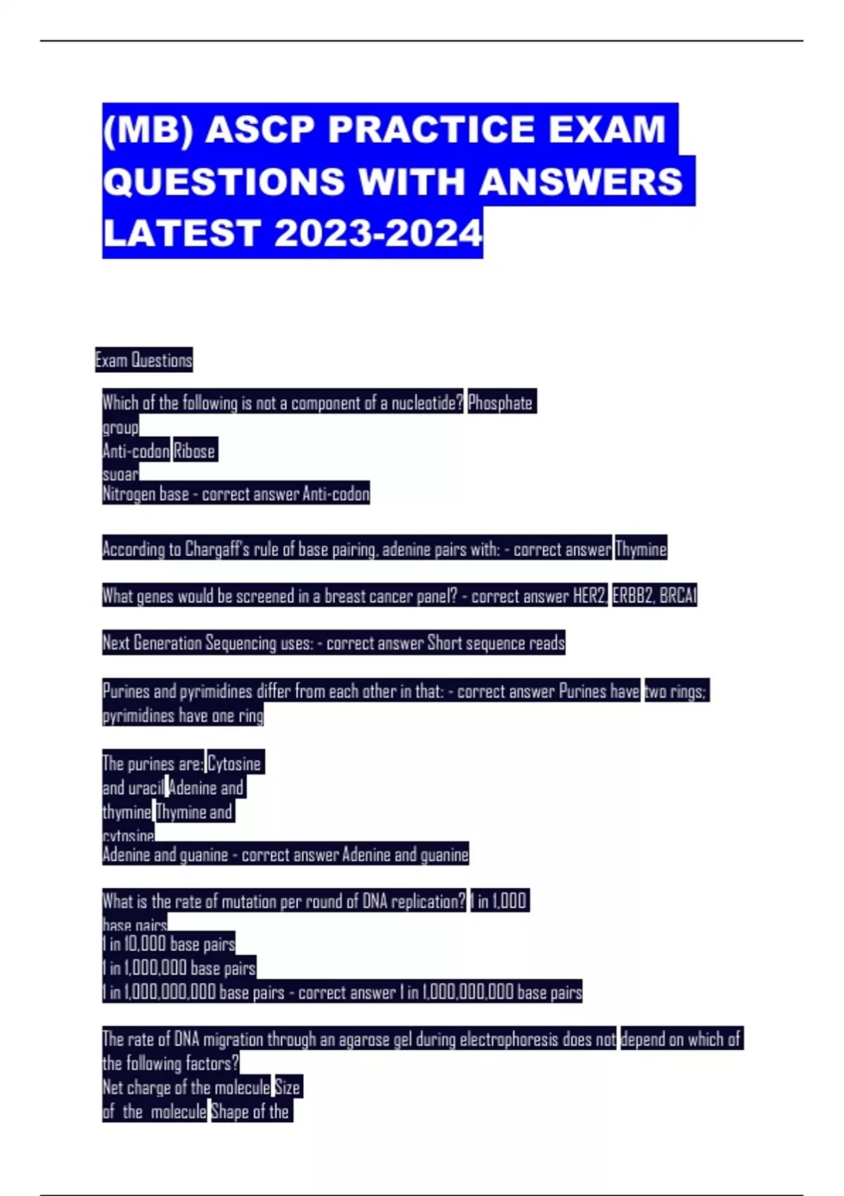 (MB) ASCP PRACTICE EXAM QUESTIONS WITH ANSWERS LATEST Exam Questions Which of the following is not a component of a nucleotide? Phosphate group Anti-codon Ribose sugar Nitrogen base - correct answer Anti-codon According to Chargaff's rule of base pairing, adenine pairs with: - correct answer Thymine What genes would be screened in a breast cancer panel? - correct answer HER2, ERBB2, BRCA1 Next Generation Sequencing uses: - correct answer Short sequence reads Purines and pyrimidines differ from each other in that: - correct answer Purines have two rings; pyrimidines have one ring The purines are: Cytosine and uracil Adenine and thymine Thymine and cytosine Adenine and guanine - correct answer Adenine and guanine What is the rate of mutation per round of DNA replication? 1 in 1,000 base pairs 1 in 10,000 base pairs 1 in 1,000,000 base pairs 1 in 1,000,000,000 base pairs - correct answer 1 in 1,000,000,000 base pairs The rate of DNA migration through an agarose gel during electrophoresis does not depend on which of the following factors? Net charge of the molecule Size of the molecule Shape of the molecule Nucleotide sequence of the molecule - correct answer Nucleotide sequence of the molecule What are the phases in a qPCR Amplification Plot? Initiation, exponential, plateau Baseline, exponential, plateau Baseline, threshold, exponential, plateau Baseline, initiation, threshold, exponential, plateau - correct answer Initiation, exponential, plateau Find the palindrome in this restriction enzyme site: 5'-CTGCAG-3'? 5'-GAC 3'-GAC 3'-CTG 5'-GTC - correct answer 3'-GAC A patient with impaired judgment, personality changes, signs of abnormal body movements and depression comes to the physician's office for a follow-up visit. The physician suspects a single-gene disorder may be the cause of those clinical manifestations. A blood specimen was then sent to your clinical laboratory for mutation screening in the Huntington gene. Testing with standard PCR indicates that patient has Huntington Disease, HD. Which of the following would be consistent with this diagnosis? 25 CAG repeats in the Huntington gene 85 CAG repeats in the Huntington gene 25 CGA repeats in the Huntington gene 85 CGA repeats in the Huntington gene - correct answer 85 CAG repeats in the Huntington gene Which two HPV types are responsible for most cases of cervical cancer? 16 and 18 31 and 59 16 and 58 44 and 59 - correct answer 16 and 18 Replication forks, known as origins of DNA replication, are created by this enzyme: Ligase Taq Polymerase Primase Helicase - correct answer Helicase Mutation in what gene is associated with Fragile X syndrome? - correct answer FMR1 Mantle cell lymphoma (MCL) is caused by what translocation? - correct answer t(11;14) This polymerase is involved in "initiation of DNA replication and has primase activity": - correct answer Pol α Its discovery shed light on why there is simultaneous, though not continuous, synthesis of DNA on both leading and lagging strands of DNA: Klenow fragment of DNA polymerase Okazaki fragments