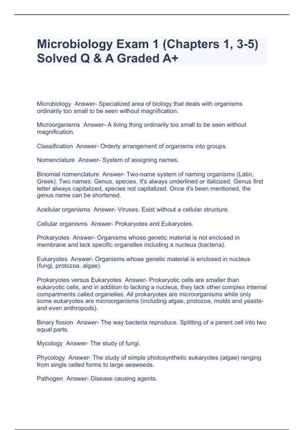Microbiology Exam 1 (Chapters 1, 3-5) Solved Q & A Graded A+
