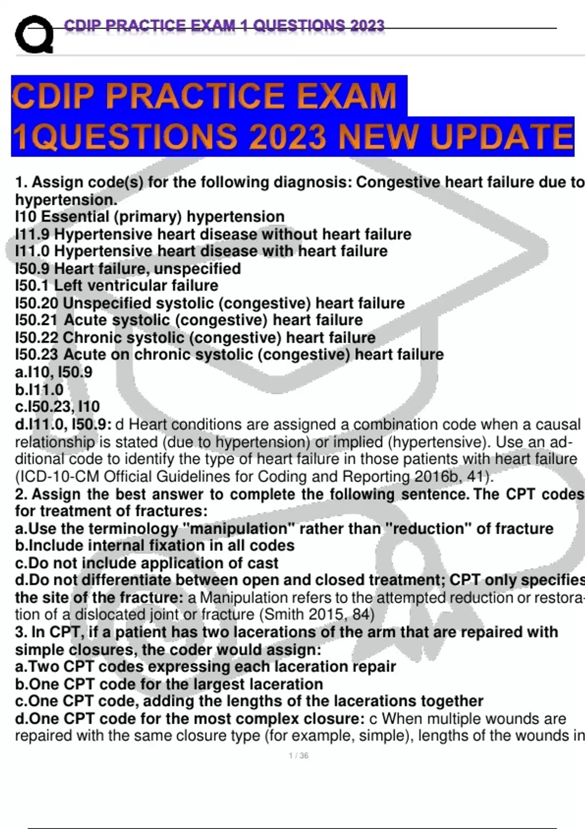 CDIP PRACTICE EXAM 1QUESTIONS 2023 NEW UPDATE 1. Assign code(s) for the following diagnosis: Congestive heart failure due to hypertension. I10 Essential (primary) hypertension I11.9 Hypertensive heart disease without heart failure I11.0 Hypertensive heart disease with heart failure I50.9 Heart failure, unspecified I50.1 Left ventricular failure I50.20 Unspecified systolic (congestive) heart failure I50.21 Acute systolic (congestive) heart failure I50.22 Chronic systolic (congestive) heart failure I50.23 Acute on chronic systolic (congestive) heart failure a.I10, I50.9 b.I11.0 c.I50.23, I10 d.I11.0, I50.9: d Heart conditions are assigned a combination code when a causal relationship is stated (due to hypertension) or implied (hypertensive). Use an ad- ditional code to identify the type of heart failure in those patients with heart failure (ICD-10-CM Official Guidelines for Coding and Reporting 2016b, 41). 2. Assign the best answer to complete the following sentence. The CPT codes for treatment of fractures: a.Use the terminology "manipulation" rather than "reduction" of fracture b.Include internal fixation in all codes c.Do not include application of cast d.Do not differentiate between open and closed treatment; CPT only specifies the site of the fracture: a Manipulation refers to the attempted reduction or restora- tion of a dislocated joint or fracture (Smith 2015, 84) 3. In CPT, if a patient has two lacerations of the arm that are repaired with simple closures, the coder would assign: a.Two CPT codes expressing each laceration repair b.One CPT code for the largest laceration c.One CPT code, adding the lengths of the lacerations together d.One CPT code for the most complex closure: c When multiple wounds are repaired with the same closure type (for example, simple), lengths of the wounds in the same classification and from all anatomical sites that are grouped together into the same code descriptor should be added together (Smith 2015, 67). 4. Patient admitted for laparoscopic repair of right diaphragmatic hernia. As- sign the ICD-10-PCS procedure code for this surgery. 0BQR4ZZ Repair right diaphragm, percutaneous endoscopic approach 0BQROZZ Repair right diaphragm, open approach 0BQS4ZZ Repair left diaphragm, percutaneous endoscopic approach 0BQSOZZ Repair left diaphragm, open approach a.0BQR4ZZ b.0BQR0ZZ c.0BQS4ZZ d.0BQS0ZZ: a Surgery is the only treatment for diaphragmatic hernias. ICD-10-PCS code 0BQR4ZZ, is used for laparoscopic repair of diaphragmatic hernia (Garvin 2015, 192, 284) 5. When trying to determine if documentation is present to substantiate status asthmaticus, the coder should review the record for what terms and phrases? a.Intractable pneumonia b.Refractory asthma and severe, intractable wheezing c.Airway obstruction relieved by bronchodilators d.Limited but pronounced wheezing: b Status asthmaticus is defined as continual wheezing in spite of therapy (Leon-Chisen 2013, 230). 6. Gastrointestinal bleeding can manifest as: a.Hematemesis, which indicates acute upper gastrointestinal hemorrhage b.Petechia c.Vomiting d.Constipation, which indicates upper or lower gastrointestinal hemorrhage: a Gastrointestinal bleeding manifests itself in several ways. These are hematemesis, melena, occult bleeding, hematochezia (Leon-Chisen 2013, 244). 7. Which types of pacemaker devices have a unique ICD-10-PCS code. a.Dual chamber rate responsive