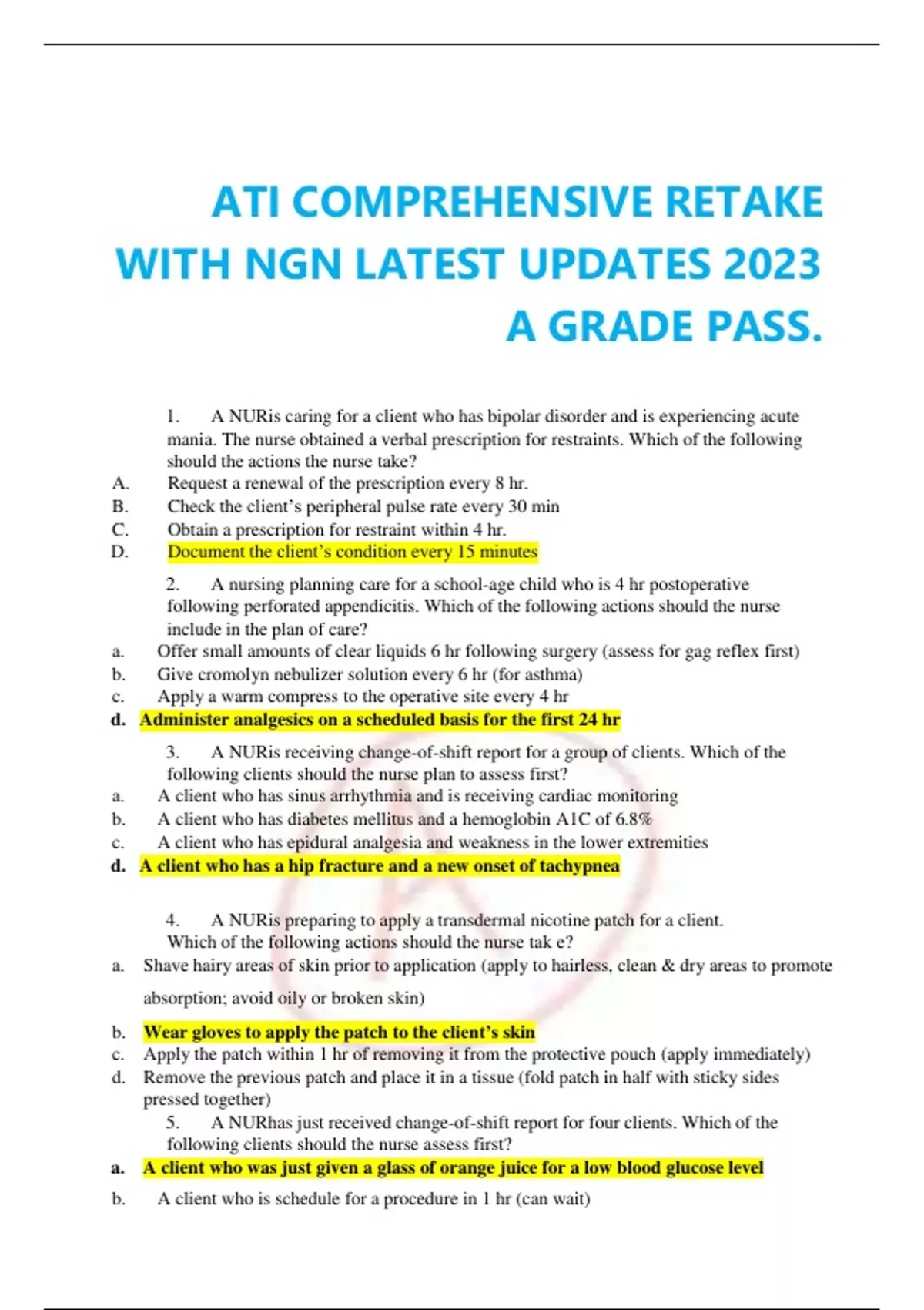 ATI COMPREHENSIVE RETAKE WITH NGN LATEST UPDATES 2023 A GRADE PASS. 1. A NURis caring for a client who has bipolar disorder and is experiencing acute mania. The nurse obtained a verbal prescription for restraints. Which of the following should the actions the nurse take? A. Request a renewal of the prescription every 8 hr. B. Check the client’s peripheral pulse rate every 30 min C. Obtain a prescription for restraint within 4 hr. D. Document the client’s condition every 15 minutes 2. A nursing planning care for a school-age child who is 4 hr postoperative following perforated appendicitis. Which of the following actions should the nurse include in the plan of care? a. Offer small amounts of clear liquids 6 hr following surgery (assess for gag reflex first) b. Give cromolyn nebulizer solution every 6 hr (for asthma) c. Apply a warm compress to the operative site every 4 hr d. Administer analgesics on a scheduled basis for the first 24 hr 3. A NURis receiving change-of-shift report for a group of clients. Which of the following clients should the nurse plan to assess first? a. A client who has sinus arrhythmia and is receiving cardiac monitoring b. A client who has diabetes mellitus and a hemoglobin A1C of 6.8% c. A client who has epidural analgesia and weakness in the lower extremities d. A client who has a hip fracture and a new onset of tachypnea 4. A NURis preparing to apply a transdermal nicotine patch for a client. Which of the following actions should the nurse tak e? a. Shave hairy areas of skin prior to application (apply to hairless, clean & dry areas to promote absorption; avoid oily or broken skin) b. Wear gloves to apply the patch to the client’s skin c. Apply the patch within 1 hr of removing it from the protective pouch (apply immediately) d. Remove the previous patch and place it in a tissue (fold patch in half with sticky sides pressed together) 5. A NURhas just received change-of-shift report for four clients. Which of the following clients should the nurse assess first? a. A client who was just given a glass of orange juice for a low blood glucose level b. A client who is schedule for a procedure in 1 hr (can wait) c. A client who has 100 mL fluid remaining in his IV bag (can wait) d. A client who received a pain medication 30 min ago for postoperative pain 6. A NURis caring for a client who is receiving intermittent enteral tube feedings. Which of the following places the client at risk for aspiration? a. A history of gastroesophageal reflux disease b. Receiving a high osmolarity formula c. Sitting in a high-Fowler’s position during the feeding d. A residual of 65 mL 1hr postprandial 7. A NURis reviewing the laboratory results for a client who has Cushing’s disease. The nurse should expect the client to have an increase in which of the following laboratory values? a. Serum glucose level- increased b. Serum calcium level-decreased c. Lymphocyte count- decreased immune system. d. Serum potassium level- decreased . 8. A NURis caring for a client who has severe preeclampsia and is receiving magnesium sulfate intravenously. The nurse discontinues the magnesium sulfate after the client displaces toxicity. Which of the following actions should the nurse take? a. Position the client supine b. Prepare an IV bolus of dextrose 5% in water c. Administer methylergonovine IM d. Administer calcium gluconate IV Calcium gluconate is given for magnesium sulfate toxicity. Always have an injectable form of calcium gluconate available when administering magnesium sulfate by IV. 9. A charge nurse is teaching new staff members about factors that increase a client’s risk to become violent. Which of the following risk factors should the nurse include as the best predictor of future violence? a. Experiencing delusions b. Male gender c. Previous violent behavior d. A history of being in prison Risk factors also include: past history of aggression, poor impulse control, and violence. Comorbidity that leads to acts of violence (psychotic delusions, command hallucinations, violent angry reactions with cognitive disorders). Individual Assessment for Violence 10. A NURis preparing to perform a sterile dressing change. Which of the following actions should the nurse take when setting up the sterile field? a. Place the cap from the solution sterile side up on clean surface b. Open the outermost flap of the sterile kit toward the body→ flap AWAY from the body's first c. Place the sterile dressing within 1.25 cm (0.5in) of the edge of the sterile field → 2.5 cm (1-inch) border around any sterile drape or wrap that is considered contaminated. d. Set up the sterile field 5 cm (2 in) below waist level→ it says BELOW waist level; should be ABOVE waist level