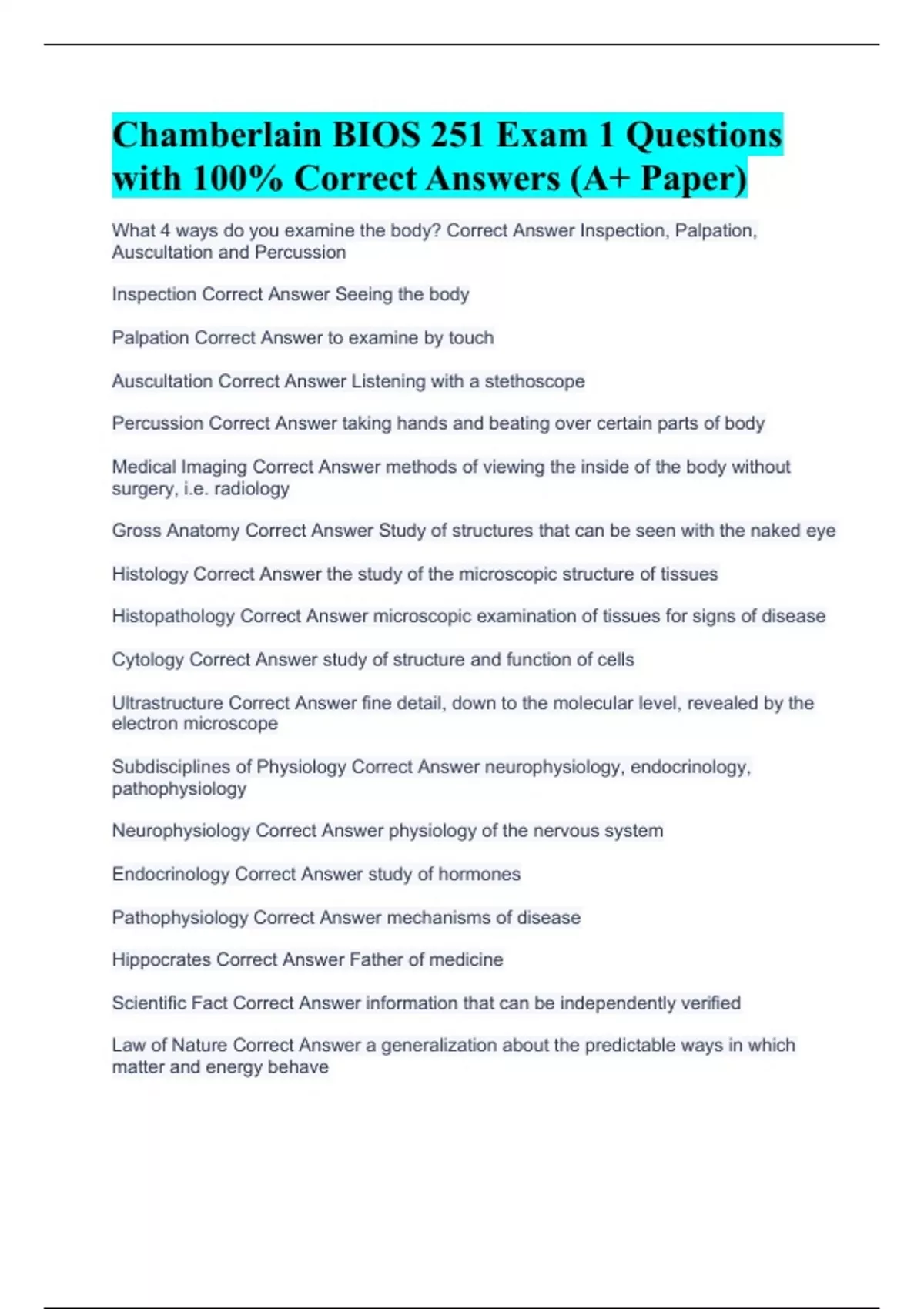 Chamberlain BIOS 251 Exam 1 Questions with 100% Correct Answers (A+ Paper)