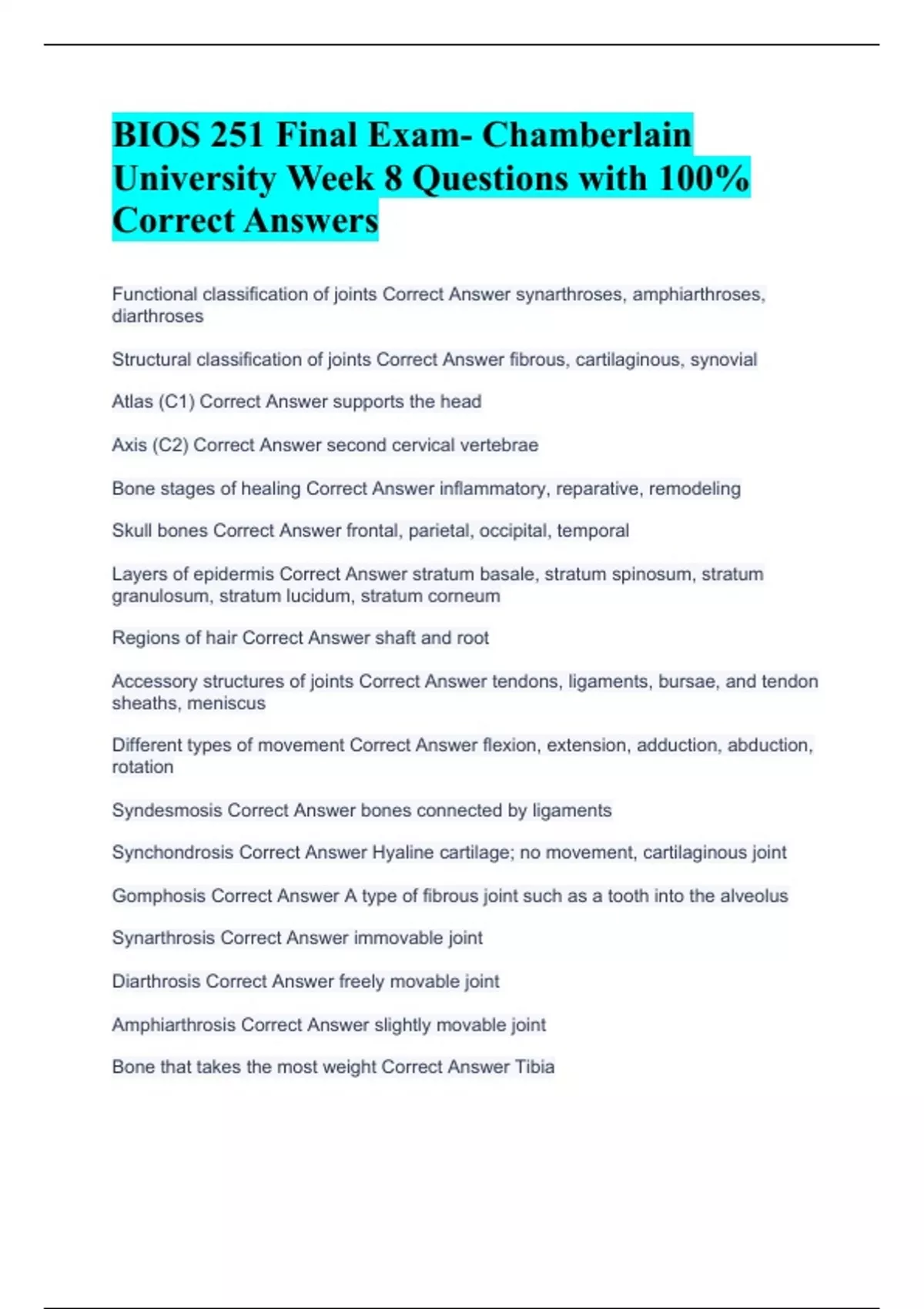 BIOS 251 Final Exam- Chamberlain University Week 8 Questions with 100% Correct Answers