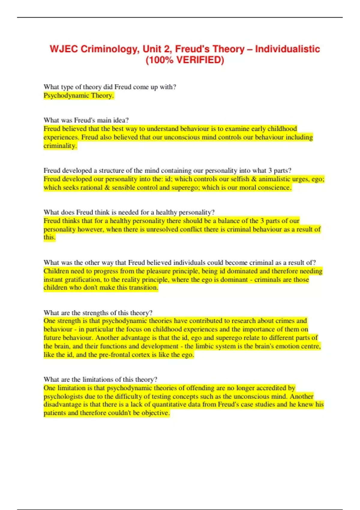 WJEC Criminology, Unit 2, Freud's Theory – Individualistic (100% VERIFIED).
