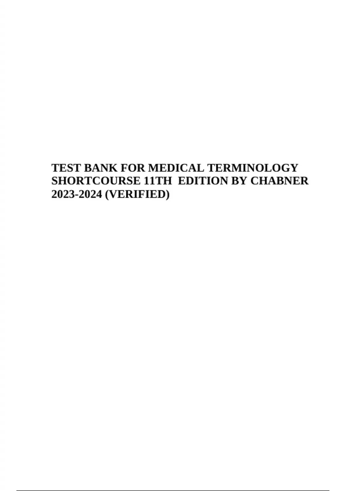 TEST BANK FOR MEDICAL TERMINOLOGY SHORTCOURSE 11TH EDITION BY CHABNER (VERIFIED). Gastrectomy: a. Gastric resection b. Intestinal incision c. Tumor of the stomach d. Incision of the stomach e. Resection of the intestine ANS: A REF: p. 9 OBJ: Analyze medical terms. 2. Osteitis: a. Incision of a bone b. Removal of a bone c. Incision of a joint d. Inflammation of a joint e. Inflammation of a bone ANS: E REF: p. 4 | p. 11 OBJ: Analyze medical terms. 3. Cystoscopy: a. Study of cells b. Visual examination of cells c. Removal of a sac of fluid d. Removal of the urinary bladder e. Visual examination of the urinary bladder ANS: E REF: p. 8 OBJ: Analyze medical terms. 4. Hepatoma: a. Incision of the kidney b. Tumor of the liver c. Blood mass d. Inflammation of the liver e. Red blood cell ANS: B REF: p. 13 OBJ: Analyze medical terms. 5. Iatrogenic: a. Pertaining to produced by treatment b. Produced by the mind c. Cancer producing d. Pertaining to producing a tumor e. Cutting into a tumor ANS: A REF: p. 10 | p. 13 OBJ: Analyze medical terms. 6. Electroencephalogram: a. Record of electricity in the brain b. Record of electricity in the heart c. X-ray of the brain d. Record of sound waves in the brain e. X-ray of the heart and brain ANS: A REF: p. 9 OBJ: Analyze medical terms. 7. Diagnosis: a. Made after the prognosis b. A guess as to the patient’s condition c. A prediction of the course of treatment d. Made on the basis of complete knowledge about the patient’s condition e. A treatment of the patient ANS: D REF: p. 10 OBJ: Analyze medical terms. 8. Cancerous tumor: a. Hematoma b. Adenoma c. Carcinoma d. Carcinogenic e. Neurotomy ANS: C REF: p. 7 OBJ: Analyze medical terms. 9. Microscopic examination of living tissue: a. Incision b. Pathology c. Biopsy d. Autopsy e. Resection ANS: C REF: p. 7 OBJ: Use word parts to build terms. 10. Pertaining to the largest part of the brain: a. Cerebral b. Cephalic c. Renal d. Cardiac e. Neural ANS: A REF: p. 8 OBJ: Use word parts to build terms. 11. Removal of a gland: a. Gastrotomy b. Gastric c. Hepatic resection d. Nephric section e. Adenectomy ANS: E REF: p. 7 | p. 13 OBJ: Use word parts to build terms. ANS: E REF: p. 7 | p. 13 OBJ: Use word parts to build terms. 12. Decrease in numbers of red blood cells or hemoglobin within red blood cells: a. Anemia b. Erythrocytosis c. Thrombocytosis d. Leukemia e. Leukocytosis ANS: A REF: p. 14 OBJ: Use word parts to build terms. 13. Pathologist is one who: a. Examines x-rays b. Operates on the urinary tract c. Performs autopsies and examines biopsies d. Operates on the kidney e. Treats diseases with chemicals ANS: C REF: p. 11 OBJ: Analyze medical terms. 14. Pain in a joint: a. Ostealgia b. Arthritis c. Osteoarthritis d. Arthroalgia e. Arthralgia ANS: E REF: p. 7 | p. 13 OBJ: Use word parts to build terms. 15. Increase in number of malignant white blood cells: a. Leukocytosis b. Leukemia c. Erythremia d. Thrombocytosis e. Erythrocytosis ANS: B REF: p. 13 OBJ: Use word parts to build terms. 16. Instrument to view the eye: a. Ophthalmoscopy b. Opthalmoscope c. Opthalmology d. Ophthalmoscope e. Opthalmoscopy ANS: D REF: p. 11 OBJ: Use word parts to build terms. 17. A platelet: a. Hematoma b. Thrombosis c. Leukocyte d. Thrombocyte e. Erythrocyte ANS: D REF: p. 12 OBJ: Analyze medical terms. 18. Abnormal condition of the mind: a. Physchosis b. Psychosis c. Psychogenic d. Encephalopathy e. Adenoma ANS: B REF: p. 12 | p. 14 OBJ: Use word parts to build terms. 19. Inflammation of the nose: a. Arthrosis b. Hepatitis c. Nephritis d. Dermatosis e. Rhinitis ANS: E REF: pp. 12-13 OBJ: Use word parts to build terms. 20. Study of cells: a. Pathology b. Cytology c. Cystology d. Dermatology e. Hematology ANS: B REF: p. 9 | p. 13 OBJ: Use word parts to build terms. 21. Pertaining to through the liver: a. Subrenal b. Transdermal c. Transhepatic d. Subhepatic e. Hepatoma ANS: C REF: p. 10 | p. 15 OBJ: Use word parts to build terms. 22. Abnormal condition of the kidney: a. Neurologic b. Neuralgia c. Nephrotomy d. Neural e. Nephrosis ANS: E REF: p. 10 | p. 14 OBJ: Use word parts to build terms. 23. Incision of a bone: a. Sarcoma b. Pathogenic c. Osteotomy d. Ostectomy e. Endoscopy ANS: C REF: p. 11 | p. 14 OBJ: Use word parts to build terms. 24. High level of sugar in the blood: a. Hematoma b. Hypodermic c. Hypoglycemia d. Hyperglycemia e. Hypogastric ANS: D REF: p. 10 OBJ: Use word parts to build terms. Select the term that is spelled correctly. 25. Resection of a nerve: a. neruotomy b. neurectomy c. neurotomy ANS: B REF: p. 10 | p. 13 OBJ: Spell and pronounce terms. 26. Pertaining to produced by treatment: a. iatrogenic b. iatragenic c. itarogenic ANS: A REF: p. 10 | p. 13 OBJ: Spell and pronounce terms. 27. Pertaining to the cerebrum: a. cerebrol b. serebral c. cerebral ANS: C REF: p. 8 OBJ: Spell and pronounce terms. 28. Cancerous tumor: a. carcinoma b. carsinoma c. karsinoma ANS: A REF: p. 7 OBJ: Spell and pronounce terms. 29. Collection of blood: a. hepatoma b. hematoma c. hepitoma ANS: B REF: p. 10 OBJ: Spell and pronounce terms. 30. High blood sugar: a. hypoglycemia b. hyperglicemia c. hyperglycemia ANS: C REF: p. 10 OBJ: Spell and pronounce terms. 31. Membrane surrounding the heart: a. perycardium b. pericardium c. pericardum ANS: B REF: p. 15 OBJ: Spell and pronounce terms. 32. Instrument to examine within: a. endoscope b. endoskope c. endoscopy ANS: A REF: pp. 14-15 OBJ: Spell and pronounce terms. 33. Disease of the intestines: a. entrapathy b. interopathy c. enteropathy ANS: C REF: p. 9 | p. 14 OBJ: Spell and pronounce terms. 34. Inflammation of the urinary bladder: a. cytitis b. cystitis c. sistitis ANS: B REF: p. 8 | p. 13 OBJ: Spell and pronounce terms. Select the correct meaning for the following combining forms. 35. arthr/o: a. gland b. red c. joint ANS: C REF: p. 7 OBJ: Learn basic word parts. 36. cyst/o: a. urinary bladder b. cell c. to secrete ANS: A REF: p. 8 OBJ: Learn basic word parts. 37. encephal/o: a. electricity b.