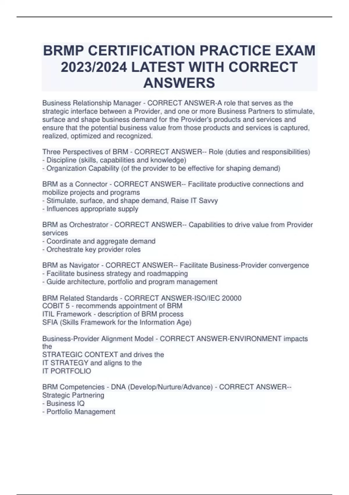 BRMP CERTIFICATION PRACTICE EXAM 2023/2024 LATEST WITH CORRECT ANSWERS Business Relationship Manager - CORRECT ANSWER-A role that serves as the strategic interface between a Provider, and one or more Business Partners to stimulate, surface and shape business demand for the Provider's products and services and ensure that the potential business value from those products and services is captured, realized, optimized and recognized. Three Perspectives of BRM - CORRECT ANSWER-- Role (duties and responsibilities) - Discipline (skills, capabilities and knowledge) - Organization Capability (of the provider to be effective for shaping demand) BRM as a Connector - CORRECT ANSWER-- Facilitate productive connections and mobilize projects and programs - Stimulate, surface, and shape demand, Raise IT Savvy - Influences appropriate supply BRM as Orchestrator - CORRECT ANSWER-- Capabilities to drive value from Provider services - Coordinate and aggregate demand - Orchestrate key provider roles BRM as Navigator - CORRECT ANSWER-- Facilitate Business-Provider convergence - Facilitate business strategy and roadmapping - Guide architecture, portfolio and program management BRM Related Standards - CORRECT ANSWER-ISO/IEC 20000 COBIT 5 - recommends appointment of BRM ITIL Framework - description of BRM process SFIA (Skills Framework for the Information Age) Business-Provider Alignment Model - CORRECT ANSWER-ENVIRONMENT impacts the STRATEGIC CONTEXT and drives the IT STRATEGY and aligns to the IT PORTFOLIO BRM Competencies - DNA (Develop/Nurture/Advance) - CORRECT ANSWER-- Strategic Partnering - Business IQ - Portfolio Management - Provider Domain Knowledge - Powerful Communications - Business Transition Management Strategic Partnering (DNA) - CORRECT ANSWER-Goal of BRM is to establish a Strategic Partnership between the Provider and the Businesses it serves Business IQ (DNA) - CORRECT ANSWER-One of the reasons the strategic partnership goal has been so elusive is that Provider organizations often fall short in understanding and speaking the language of their Business Partners. Portfolio Management (DNA) - CORRECT ANSWER-To optimize value realization from a Provider's products, services, assets and capabilities, the discipline of Portfolio Management is crucial to the expression of business strategy and the investment and risk choices that must be made in pursuing that strategy. Provider Domain (DNA) - CORRECT ANSWER-The associated disciplines of Service Management are drawn as the next ring because value realization also depends on having the right provider services delivered in the most effective way. Business Transition Management (DNA) - CORRECT ANSWER-A common cause for loss in realization is the failure to properly manage business transitions enabled by a Provider's services (such as process improvement, new business capabilities). Powerful Communications - CORRECT ANSWER-Drawn as the outermost ring of the BRM DNA graphic because all the competencies referenced in the inner rings and core depend on it. Roof of the House of BRM - CORRECT ANSWER-Clarity of the BRM Role in the context of the Provider Strategy and Operating Model Business Relationship Maturity Model - CORRECT ANSWER-L1: Ad Hoc L2: Order Taker L3: Service Provider L4: Trusted Advisor L5: Strategic Partner Demand Shaping Discipline - CORRECT ANSWER-- A set of disciplines, tools and governance mechanisms designed to surface stimulate and shape business demand for Provider products and services in balance with supply constraints. - Ensures that provider capabilities are full leveraged. - Optimizes value realized through services Exploring Discpline - CORRECT ANSWER-- Identifies and rationalizes demand for Provider services - Identifies business and technology trends with the potential to create value. - Identifies new business value initiatives Servicing Discipline - CORRECT ANSWER-- Coordinates Provider resources - Manages the expectations of the Business Partner - Translates demand into supply requirements - Facilitates Business Strategy, business capability roadmapping, portfolio and program management Value Harvesting Discipline - CORRECT ANSWER-- Ensures the success of business change initiatives - Tracks and reviews performance - Provides input to continuous improvement actives - Provides insights to the results of business change and initiates Demand Shaping aka Demand Management - CORRECT ANSWER-Goal of the BRM is to create optimum value from limited IT supply. Must also assess demand, it may not be cost effective to satisfy all demand. Expression Barrier - CORRECT ANSWER-Lack of clarity of the business strategy - STRATEGIC CONTEXT Strategic Relationship Management Steps - CORRECT ANSWER-1. Initiation/Overview 2. Discovery 3. Planning 4. Execution 5. Extend and Expand Specification barrier - CORRECT ANSWER-Difficulty of determining just what the business wants IT to do - IT STRATEGY Implementation Barrier - CORRECT ANSWER-Refers to those things that prevent the development of an IT Portfolio that adequately supports the business strategy. (infrastructure) - IT PORTFOLIO Contextual Barrier - CORRECT ANSWER-Deeply ingrained factors such as organization culture, rules of engagement, attitude to change and whether it is a rule or relationship driven - ENVIRONMENT Credibility Equation - CORRECT ANSWER-Credibility = expertise + trustworthiness Key components to climbing the maturity levels Capability - CORRECT ANSWER-Everything it takes, both visible and behind the scenes, that makes producing a good or providing a service possible. Value Chain Capabilites - CORRECT ANSWER-Provide value to the business partner Demand Governance Capabilities - CORRECT ANSWER-Those which are needed to managed the demand that flows into the value chai