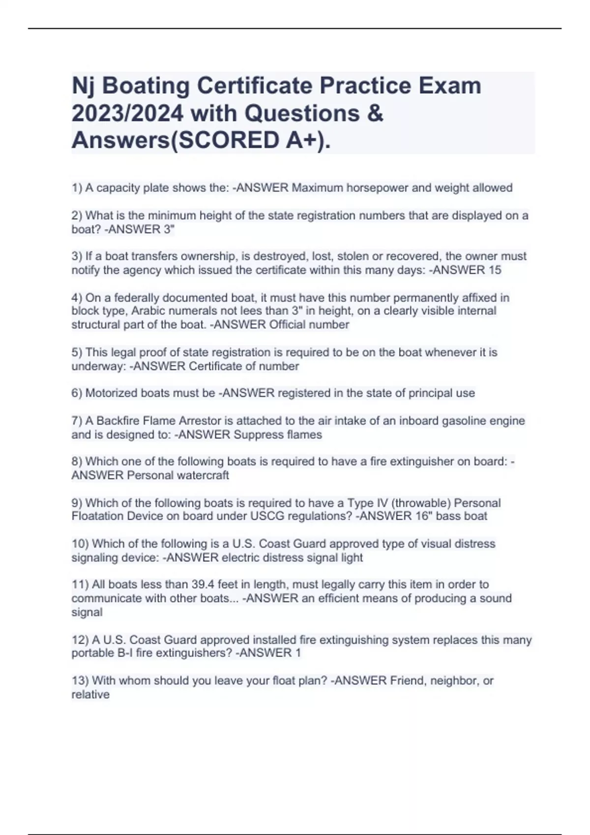 Nj Boating Certificate Practice Exam 2023/2024 with Questions & Answers(SCORED A+).