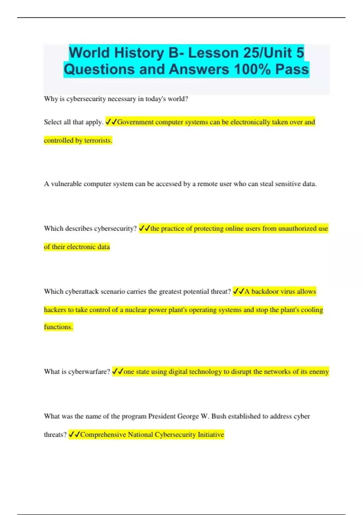 World History B- Lesson 25/Unit 5 Questions and Answers 100% Pass Why is cybersecurity necessary in today's world? Select all that apply. Government computer systems can be electronically taken over and controlled by terrorists. A vulnerable computer system can be accessed by a remote user who can steal sensitive data. Which describes cybersecurity? the practice of protecting online users from unauthorized use of their electronic data Which cyberattack scenario carries the greatest potential threat? A backdoor virus allows hackers to take control of a nuclear power plant's operating systems and stop the plant's cooling functions. What is cyberwarfare? one state using digital technology to disrupt the networks of its enemy What was the name of the program President George W. Bush established to address cyber threats? Comprehensive National Cybersecurity Initiative Which US government entity was established to monitor the Internet to detect cyber threats? National Cybersecurity Protection System Which points out a relationship between virtual black markets and the increase in electronic crimes? The booming virtual marketplace attracts thieves who exploit its secrecy policy to target victims. How have governments responded to illegal activity taking place on virtual black markets? Select all that apply. by tracking virtual market operators via the digital trails they leave by seizing illicit websites and prosecuting their owners and operators by asking the host countries of registered websites to shut them down Which represents an example of how law enforcement agencies have dealt with the growth of the virtual black market? infecting virtual black market sites with malware to eliminate criminal activity Which most accurately describes the effect a cyberattack on the global marketplace has on individuals? Customers of a business that has been hacked suffer the loss of personal information and increased risk of identity theft. What is a rogue state? an outlaw nation that holds itself above international law Which most accurately defines cyberespionage? spying by means of illegally accessing digital computer data How did the collapse of the Soviet Union affect Germany? Germany became reunified for the first time since the end of World War II. How did the Chinese government react to the fall of Communist Russia? Chinese analysts studied the Russian collapse to determine whether Communist ideology or Soviet administrators were to blame. Which factor most contributed to the economic growth of the Asian nations located on the western shores of the Pacific Ocean? Reduced trade barriers and streamlined customs procedures has allowed goods to be easily and readily available throughout the trans-Pacific. What is a policy or system of segregation based on race? apartheid Which describes the situation in Yugoslavia following the fall of the Soviet Union? Torn by conflicting nationalistic beliefs, Yugoslavia fractured and collapsed into civil war and ethnic cleansing. Which describes a major obstacle nations encounter when dealing with a rogue state such as North Korea? The leaders of rogue states recognize no outside authority. Which best defines ISIS? a terrorist offshoot of al-Qaeda known for its brutality and extremism If humanity has passed the point where the oil supply is declining, which suggests the most practical response? reduce dependency on fossil fuels, and find alternate sources of energy Which best describes the political relationship between oil-producing states and their consumers? The government of a consumer state has a vested interest in protecting the government of oil-producing states. As demonstrated during the Ukraine uprising, which best shows the benefits of documenting events on a grassroots level? Raw camera phone video can be streamed live around the world in real time without government censorship. Which best defines the police shooting that occurred in Ferguson, Missouri, that resulted in widespread civil unrest? A white police officer fatally shot an unarmed black youth during an unrecorded altercation. Which identifies the relationship that Communist governments such as North Korea and China have with the media? Communist governments have implemented varying degrees of censorship of their media. Which show how electronic communications are shaping government into a more open form? Select all that apply. Video coverage of government proceedings can be uploaded to the Internet for individuals to analyze and debate. It is becoming more difficult for repressive regimes to control information to conceal human rights abuses. Which identifies the Department of Homeland Security's online operation that monitors the Internet to detect cyber threats? National Cybersecurity Protection System Which explains a case of a conflict over water rights? Natives of Sudan have not wanted to share their limited water supply, leading to civil war and killing of thousands. Which best defines arable land? soil that is suitable for plowing and capable of growing crops Which best suggests why Russia, China, and North Korea engage in malicious cyberattacks? They are rogue states beyond the law of traditional authorities. Which cyberattack carries the most serious threat? A malware attack shuts down the power plants in a large city. Which best defines cyberespionage? spying on a government through the use of digital technology