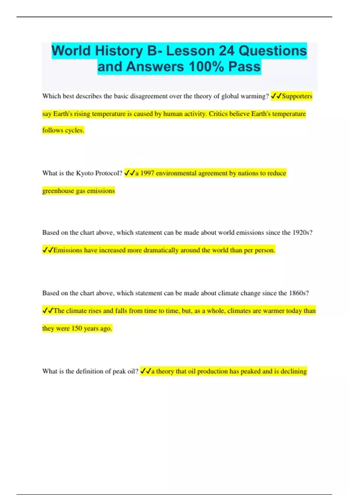 World History B- Lesson 24 Questions and Answers 100% Pass Which best describes the basic disagreement over the theory of global warming? Supporters say Earth's rising temperature is caused by human activity. Critics believe Earth's temperature follows cycles. What is the Kyoto Protocol? a 1997 environmental agreement by nations to reduce greenhouse gas emissions Based on the chart above, which statement can be made about world emissions since the 1920s? Emissions have increased more dramatically around the world than per person. Based on the chart above, which statement can be made about climate change since the 1860s? The climate rises and falls from time to time, but, as a whole, climates are warmer today than they were 150 years ago. What is the definition of peak oil? a theory that oil production has peaked and is declining Which describe the important roles Bill Gates has played in the production and promotion of the Janicki Omni Processor? Select all that apply. Gates provided the seed money for the company's start-up. Gates allowed its inventor to use his name and likeness in ads. What is the Janicki Omni Processer? a machine that converts sewer waste into clean water and electricity Which explains why China's already small percentage of arable land is diminishing? Industrial pollution and poor management have degraded China's soil. Which method of waste disposal is most damaging to the environment? dumping garbage in the ocean Which correctly detail the arguments on both sides of the global warming debate? Select all that apply. Supporters say humans need to correct the problem soon. Critics maintain that the earth is simply experiencing a natural cycle. Supporters demand immediate action to decrease CO2 emissions. Critics claim that it would hamper economic growth. What is the purpose of a carbon tax? to reduce greenhouse gas emissions Which suggests the most critical aspect of the peak oil theory? A new oil discovery means a fresh peak cycle, making that region the target of aggressors. Which describes the relationship between oil-producing Middle Eastern nations and the consumer states that consume their petroleum? Consumer states often are dependent on Mideast oil producers, but potential ties to terrorist groups are a disturbing possibility. Which are true of the Great Pacific Garbage Patch? Select all that apply. It is possibly twice the size of the continental United States. It is made up of tiny bits of plastic. Which lists the most critical factor in Australia's water crisis? Australia is the world's driest continent and was already in a serious drought when its citizens began conservation measures. How is the water conservation program working in Malaysia? The citizens are adapting proactively to personal water restrictions before the need to conserve arises. What is bioremediation? a process of decontaminating soil by using microorganisms to break down toxic substances into nontoxic forms What is arable land? soil that can be plowed and is suitable for crop cultivation