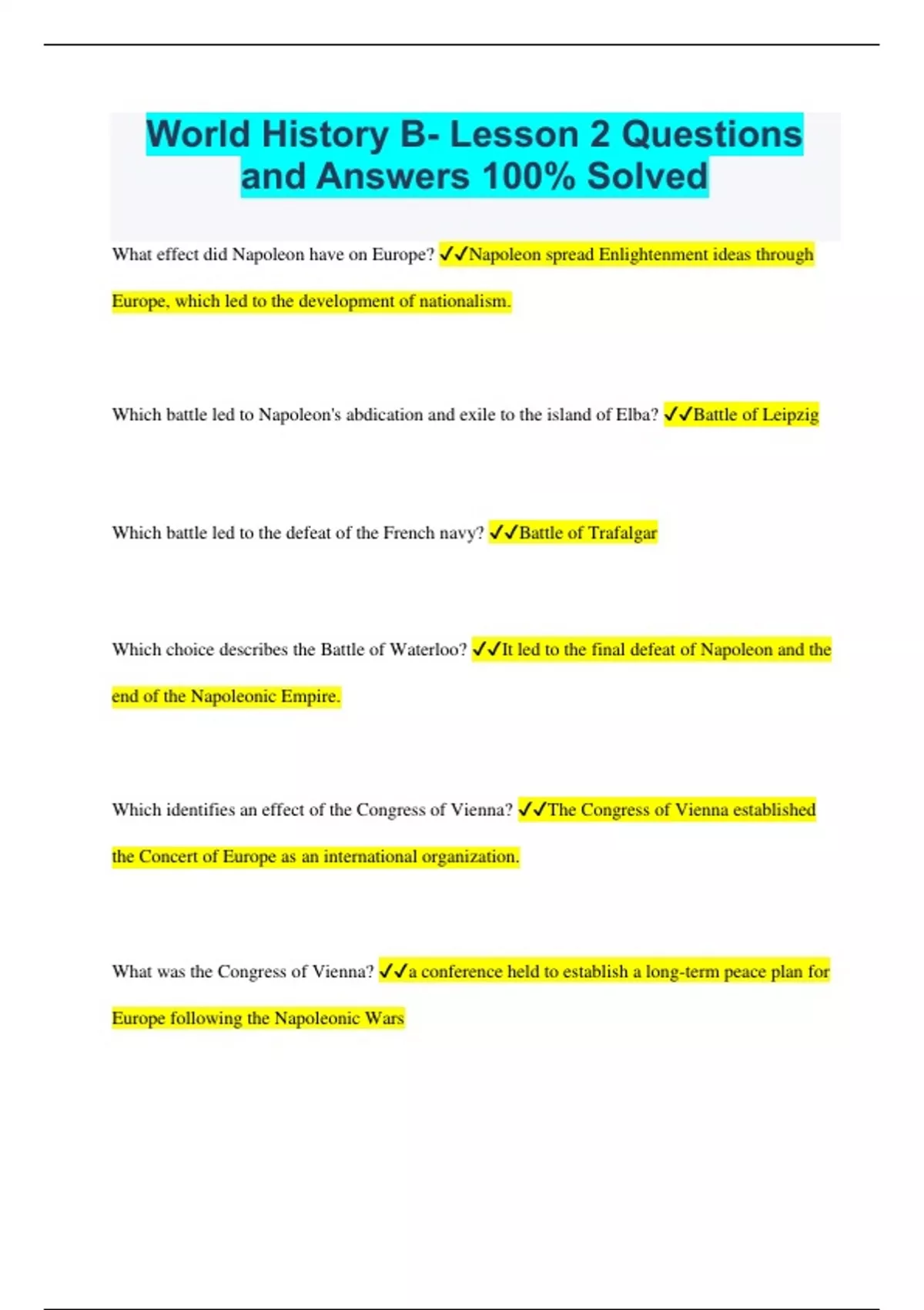 World History B- Lesson 2 Questions and Answers 100% Solved What effect did Napoleon have on Europe? Napoleon spread Enlightenment ideas through Europe, which led to the development of nationalism. Which battle led to Napoleon's abdication and exile to the island of Elba? Battle of Leipzig Which battle led to the defeat of the French navy? Battle of Trafalgar Which choice describes the Battle of Waterloo? It led to the final defeat of Napoleon and the end of the Napoleonic Empire. Which identifies an effect of the Congress of Vienna? The Congress of Vienna established the Concert of Europe as an international organization. What was the Congress of Vienna? a conference held to establish a long-term peace plan for Europe following the Napoleonic Wars Which French author used the revolution of 1830 as a backdrop in his novel Les Misérables? Victor Hugo Which novel written by Leo Tolstoy portrays the Napoleonic Wars from the Russian perspective? War and Peace What effect did the Battle of Waterloo have on the world? Great Britain became the world's sole superpower after the defeat of Napoleon. How did Napoleon's conquests in Europe affect other parts of the world? Napoleon's conquest of Spain led to independence movements in the Americas. Which identifies the effects of the Congress of Vienna? The congress system it set up became a model for the United Nations. What cultural effect did Napoleon have on Europe? Napoleon spread ideas from the French Revolution throughout Europe, leading to national unity outside of France. Which identifies Napoleon's impact on Europe? Many Germanic territories were united. What effect did Napoleon have on popular culture? Napoleon controlled art production to ensure he would be portrayed in a positive manner. What impact did the collapse of the Napoleonic Empire have on Europe? The fall of Napoleon and the spread of ideas from the French Revolution led to a rise in nationalism in many European nations. What was the effect of the Napoleonic Code? It became the set of civil laws adopted throughout Europe and other parts of the world.