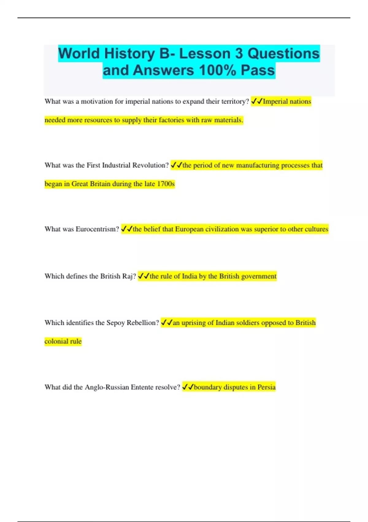 World History B- Lesson 3 Questions and Answers 100% Pass What was a motivation for imperial nations to expand their territory? Imperial nations needed more resources to supply their factories with raw materials. What was the First Industrial Revolution? the period of new manufacturing processes that began in Great Britain during the late 1700s What was Eurocentrism? the belief that European civilization was superior to other cultures Which defines the British Raj? the rule of India by the British government Which identifies the Sepoy Rebellion? an uprising of Indian soldiers opposed to British colonial rule What did the Anglo-Russian Entente resolve? boundary disputes in Persia What was the Great Game? a period of political and economic conflict between Russia and Great Britain Which describes the Crimean War? Britain, France, and the Ottoman Empire oppose Russian expansion in the Black Sea region. What role did colonies fulfill during the First Industrial Revolution? Colonies supplied the raw materials that were needed for the manufacturing process. What do the striped sections on the map indicate? They indicate the spheres of influence that imperial powers had in the Middle East and Asia. Which option describes a country wielding power over a territory? sphere of influence Which identifies a reform Peter the Great made to Russia? He modernized Russian culture. How did European imperialism influence Asia? Low Chinese demand for European goods led British traders to deal in opium, creating addicts and triggering a war. What effect did industrialization have on imperialism? Increased production led to a surplus in manufactured goods and a need for more customers. How did the people of imperial nations use Eurocentrism to justify colonialism? They believed that imposing their superior culture on tribal societies would benefit them. Which two nations held spheres of influence in both East Asia and the Middle East? Russia and Britain