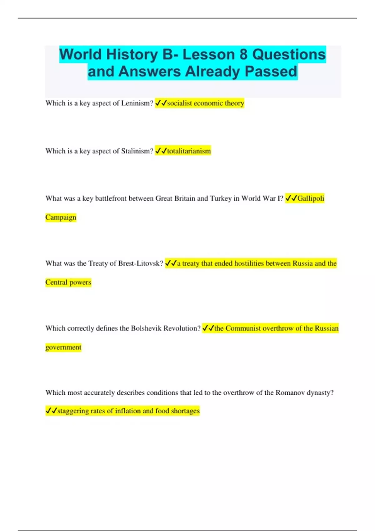 World History B- Lesson 8 Questions and Answers Already Passed Which is a key aspect of Leninism? socialist economic theory Which is a key aspect of Stalinism? totalitarianism What was a key battlefront between Great Britain and Turkey in World War I? Gallipoli Campaign What was the Treaty of Brest-Litovsk? a treaty that ended hostilities between Russia and the Central powers Which correctly defines the Bolshevik Revolution? the Communist overthrow of the Russian government Which most accurately describes conditions that led to the overthrow of the Romanov dynasty? staggering rates of inflation and food shortages Which most accurately identifies a main difference between the revolutions led by Lenin and Gandhi? Lenin wanted to establish a Communist state, while Gandhi sought independence for India. Why did Communist revolutions fail outside of Russia after World War I? Anti-Communist groups used force to suppress Communist movements. What is socialist realism? an art form that featured positive, heroic role models Who was the first leader of the Soviet state? Lenin What effect did the eastern front have on World War I? Select all that apply. The eastern front weakened Austro-Hungarian forces, making them less effective on the western front. The heavy Russian losses, combined with food and fuel shortages, led to the abdication of Czar Nicholas II. Which defines propaganda? material intended to promote a cause and sway people's beliefs or loyalties What was the outcome of the 1914 Battle of Tannenberg on the eastern front? Russia suffered almost 80,000 casualties and 90,000 prisoners of war as compared to Germany's 15,000 casualties. Which identifies the event that established a Communist government in Russia in 1917? Bolshevik Revolution How did the Russian Revolution affect the world in the years after World War I? It encouraged nationalist movements in other countries in Europe and Asia. Which most accurately analyzes the impact that World War I had on the internal politics of Russia? The loss of life and food shortages caused widespread social discontent, which forced the czar to abdicate. Who was the last czar of Russia? Nicholas II Which is an aspect of Leninism? state control of major industries How did Soviet leaders spread the Communist message effectively? by using bold, attractive posters to create a popular culture around the party's ideology