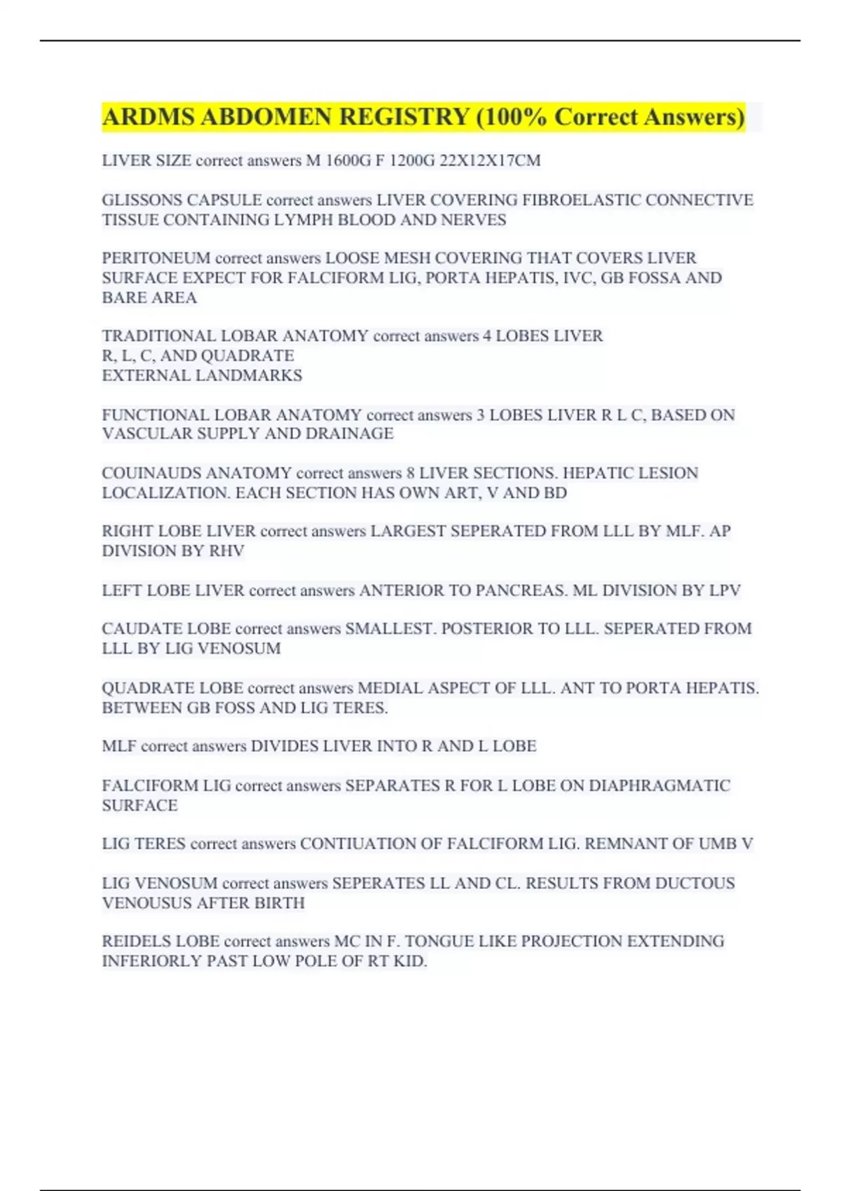 ARDMS ABDOMEN REGISTRY (100% Correct Answers)