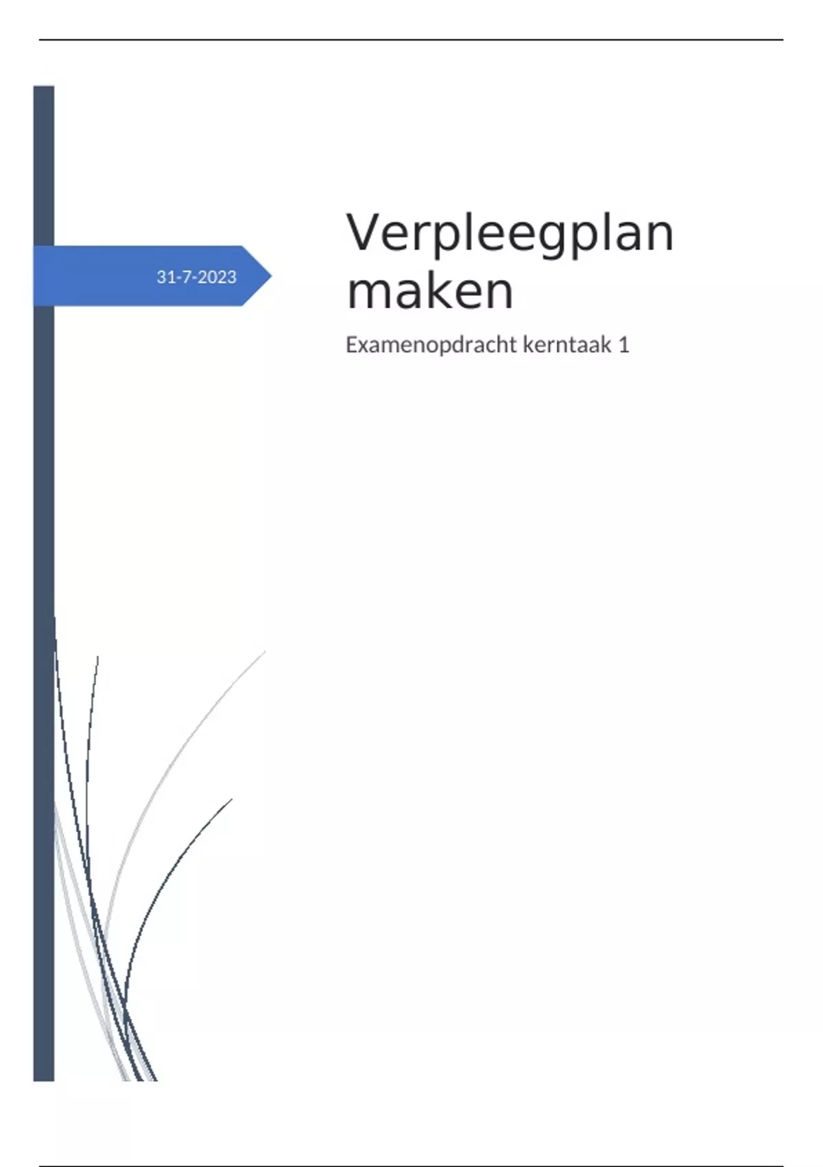 Voor het examen MBO-V is een onderdeel de kerntaak "stel een verpleegplan op". In deze uitwerking zie je hoe ik dat gedaan heb aan de hand van het NIC, NOC, NANDA model. Hierbij heb ik ook 3 gezondheidsproblemen uitgewerkt via de PES-structuur gebruikmakende van het zakboek Verpleegkundige Diagnoses van Carpenito en de 11 gezondheidspatronen volgens Gordon. Hiermee heb ik ruimschoots mijn examens gehaald en was de examen commissie zeer tevreden.