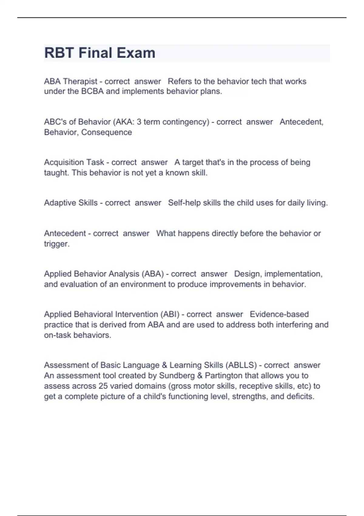 RBT Final Exam Question and answers already passed 2023/2024ABA Therapist - correct answer Refers to the behavior tech that works under the BCBA and implements behavior plans. ABC's of Behavior (AKA: 3 term contingency) - correct answer Antecedent, Behavior, Consequence Acquisition Task - correct answer A target that's in the process of being taught. This behavior is not yet a known skill. Adaptive Skills - correct answer Self-help skills the child uses for daily living. Antecedent - correct answer What happens directly before the behavior or trigger.