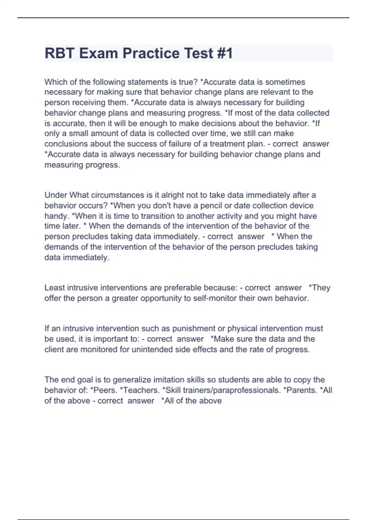 RBT Exam Practice Test Question and answers correctly solved 2023/2024Which of the following statements is true? *Accurate data is sometimes necessary for making sure that behavior change plans are relevant to the person receiving them. *Accurate data is always necessary for building behavior change plans and measuring progress. *If most of the data collected is accurate, then it will be enough to make decisions about the behavior. *If only a small amount of data is collected over time, we still can make conclusions about the success of failure of a treatment plan. - correct answer *Accurate data is always necessary for building behavior change plans and measuring progress. Under What circumstances is it alright not to take data immediately after a behavior occurs? *When you don't have a pencil or date collection device handy. *When it is time to transition to another activity and you might have time later. * When