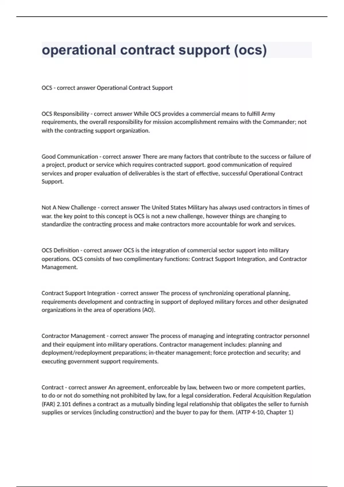operational contract support (ocs)OCS - correct answer Operational Contract Support OCS Responsibility - correct answer While OCS provides a commercial means to fulfill Army requirements, the overall responsibility for mission accomplishment remains with the Commander; not with the contracting support organization. Good Communication - correct answer There are many factors that contribute to the success or failure of a project, product or service which requires contracted support. good communication of required services and proper evaluation of deliverables is the start of effective, successful Operational Contract Support. Not A New Challenge - correct answer The United States Military has always used contractors in times of war. the key point to this concept is OCS is not a new challenge, however things are changing to standardize the contracting process and make contractors more accountable for work and services. OCS Definition - correct answer OCS is the integration of commercial sector support into military operations. OCS consists of two complimentary functions: Contract Support Integration, and Contractor Management. Contract Support Integration - correct answer The process of synchronizing operational planning, requirements development and contracting in support of deployed military forces and other designated organizations in the area of operations (AO). Contractor Management - correct answer The process of managing and integrating contractor personnel and their equipment into military operations. Contractor management includes: planning and deployment/redeployment preparations; in-theater management; force protection and security; and executing government support requirements. Contract - correct answer An agreement, enforceable by law, between two or more competent parties, to do or not do something not prohibited by law, for a legal consideration. Federal Acquisition Regulation (FAR) 2.101 defines a contract as a mutually binding legal relationship that obligates the seller to furnish supplies or services (including construction) and the buyer to pay for them. (ATTP 4-10, Chapter 1) Prime Contract - correct answer A contract or contractual action entered into by the United States Government for the purpose of obtaining supplies, materials, equipment, or services of any kind. The prime contractor is the organization that has entered into/signed the contract with the United States. (ATTP 4-10, Chapter 1) Subcontract - correct answer A subcontract is a contract entered into by a prime contractor to a subcontractor for the purpose of obtaining supplies, materials, equipment, or services under a prime contract. The prime contractor is responsible for the actions of the direct subcontractor. Likewise, subcontractors are responsible for managing any subcontractor at the next lower tier. (ATTP 4-10, Chapter 1) Requiring Activity - correct answer A requiring activity is a military or other designated supported organization that identifies, plans for, and coordinates for contracted support during military operations. A requiring activity may also be the supported unit. (ATTP 4-10, Chapter 1) Supported Unit - correct answer The supported unit is the organization that is the recipient, not necessarily the requestor, of contractor-provided support. A supported unit may also be the requiring activity, if it initiates the request for support. (ATTP 4-10, Chapter 1) OCS Responsibility of Commander - correct answer OCS planning and management is a Commander's responsibility. (ATTP 4-10, Chapter 1) OCS Responsibility of Contracting Officer - correct answer A contracting officer is the military officer, non-commissioned officer (NCO) or Army civilian with the legal authority to enter into, administer, and/or terminate contracts. The contracting officer is appointed in writing through a warrant. (ATTP 4-10, Chapter 1) OCS Responsibility of Contracting Officer Representative (COR) - correct answer The COR (sometimes referred to as a contracting officer technical representative or COTR) is a Service member or Department of Defense (DOD) Civilian, nominated by the commander, appointed, in writing, by a contracting officer. Responsibilities include monitoring contract performance and performing other duties as specified by their appointment letter. The COR does not have contracting authority and may not change the terms of the contract. (ATTP 4-10, Chapter 1)