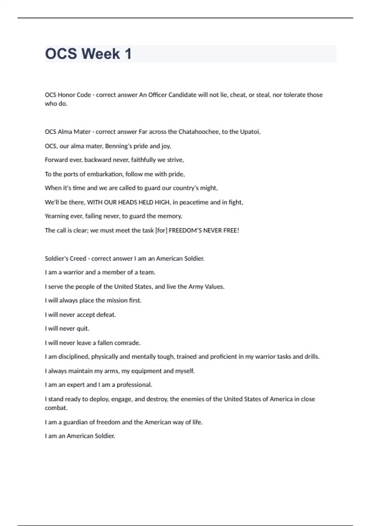 OCS Week 1OCS Honor Code - correct answer An Officer Candidate will not lie, cheat, or steal, nor tolerate those who do. OCS Alma Mater - correct answer Far across the Chatahoochee, to the Upatoi, OCS, our alma mater, Benning's pride and joy, Forward ever, backward never, faithfully we strive, To the ports of embarkation, follow me with pride, When it's time and we are called to guard our country's might, We'll be there, WITH OUR HEADS HELD HIGH, in peacetime and in fight, Yearning ever, failing never, to guard the memory, The call is clear; we must meet the task [for] FREEDOM'S NEVER FREE! Soldier's Creed - correct answer I am an American Soldier. I am a warrior and a member of a team. I serve the people of the United States, and live the Army Values. I will always place the mission first. I will never accept defeat. I will never quit. I will never leave a fallen comrade. I am disciplined, physically and mentally tough, trained and proficient in my warrior tasks and drills. I always maintain my arms, my equipment and myself. I am an expert and I am a professional. I stand ready to deploy, engage, and destroy, the enemies of the United States of America in close combat. I am a guardian of freedom and the American way of life. I am an American Soldier. Commander in Chief - correct answer Joseph R. Biden Secretary of Defense - correct answer Lloyd Austin Secretary of the Army - correct answer John E. Whitley Army Chief of Staff - correct answer General James C. McConville TRADOC Commander - correct answer General Paul E. Funk II Commander, Maneuver Center of Excellence (MCoE) - correct answer Major General Patrick J. Donahoe Commandant, United States Army Infantry Schools (USAIS) - correct answer Brigadier General David M. Hodne Commander, 199th Infantry Brigade - correct answer Colonel James T. McGahey Commander, 3-11th Infantry Battalion (OCS) - correct answer Lieutenant Colonel David T. Holstead Bravo Company Commander - correct answer CPT Parker B. White Sergeant Major of the Army - correct answer Michael A. Grinston TRADOC CSM - correct answer CSM Daniel T. Hendrex MCoE CSM - correct answer CSM Derrick C. Garner United States Army Infantry School CSM - correct answer CSM Robert K. Fortenberry