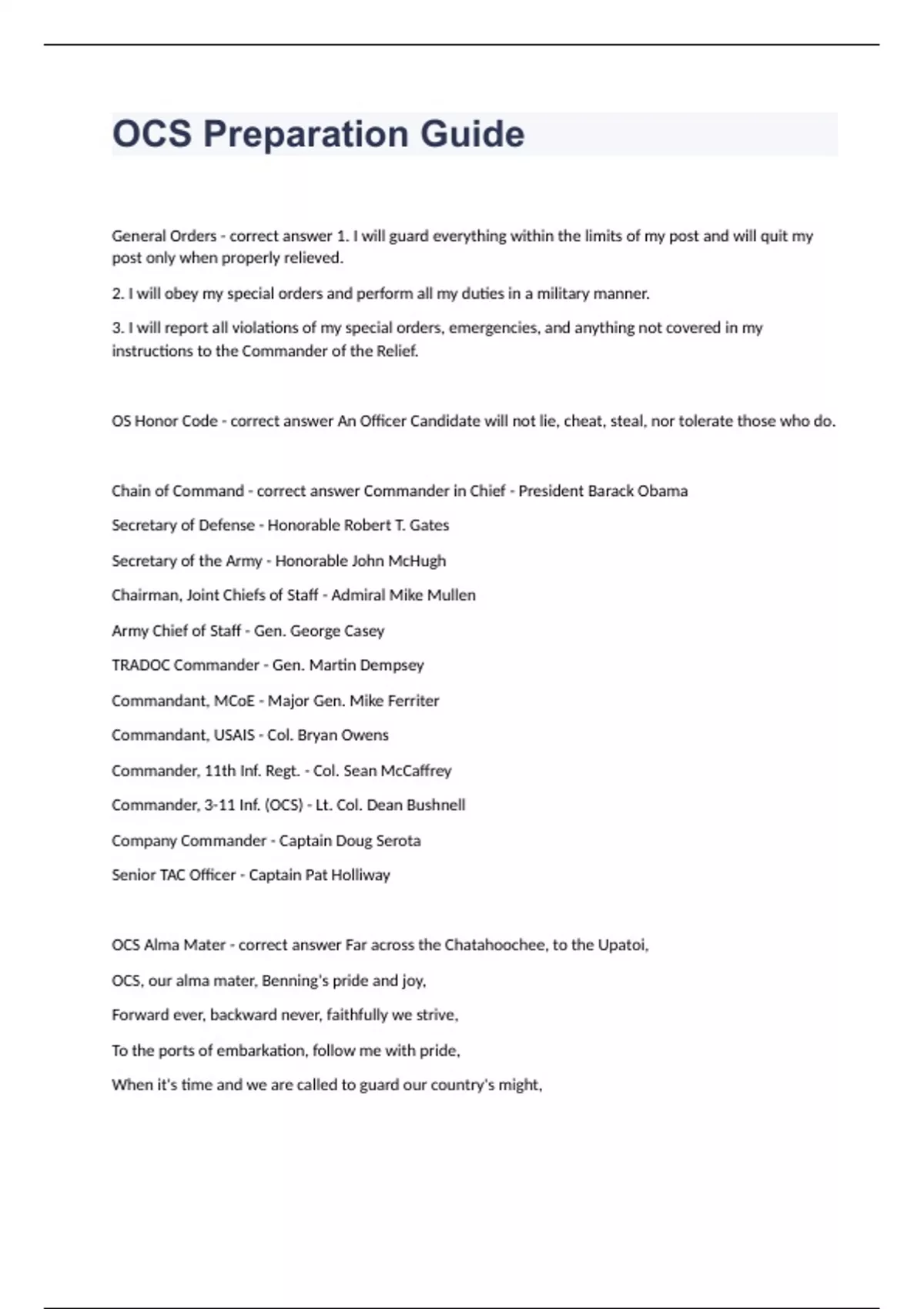 OCS Preparation GuideGeneral Orders - correct answer 1. I will guard everything within the limits of my post and will quit my post only when properly relieved. 2. I will obey my special orders and perform all my duties in a military manner. 3. I will report all violations of my special orders, emergencies, and anything not covered in my instructions to the Commander of the Relief. OS Honor Code - correct answer An Officer Candidate will not lie, cheat, steal, nor tolerate those who do. Chain of Command - correct answer Commander in Chief - President Barack Obama Secretary of Defense - Honorable Robert T. Gates Secretary of the Army - Honorable John McHugh Chairman, Joint Chiefs of Staff - Admiral Mike Mullen Army Chief of Staff - Gen. George Casey TRADOC Commander - Gen. Martin Dempsey Commandant, MCoE - Major Gen. Mike Ferriter Commandant, USAIS - Col. Bryan Owens Commander, 11th Inf. Regt. - Col. Sean McCaffrey Commander, 3-11 Inf. (OCS) - Lt. Col. Dean Bushnell Company Commander - Captain Doug Serota Senior TAC Officer - Captain Pat Holliway OCS Alma Mater - correct answer Far across the Chatahoochee, to the Upatoi, OCS, our alma mater, Benning's pride and joy, Forward ever, backward never, faithfully we strive, To the ports of embarkation, follow me with pride, When it's time and we are called to guard our country's might, We'll be there, WITH OUR HEADS HELD HIGH, in peacetime and in fight, Yearning ever, failing never, to guard the memory, The call is clear; we must meet the task [for] FREEDOM'S NEVER FREE! Proffer No Excuses - correct answer Never volunteer excuses or explain a shortcoming unless an explanation is required. The Army demands results. More damage than good is done by proffering unsought excuses. The Troop Leading Procedures - correct answer 1. Receive the Mission 2. Issue the Warning Order 3. Make a Tentative Plan 4. Initiate Necessary Movement 5. Conduct Reconnaissance 6. Complete the Plan 7. Issue the Complete Order 8. Supervise The 5 Paragraph OPORD - correct answer 1. Situation a. Enemy Forces b. Friendly Forces c. Attachments/Detachments 2. Mission 3. Execution a. Concept of Operation 1. Maneuver 2. Fires 3. Counter Air Operations 4. Intelligence 5. Electronic Warfare