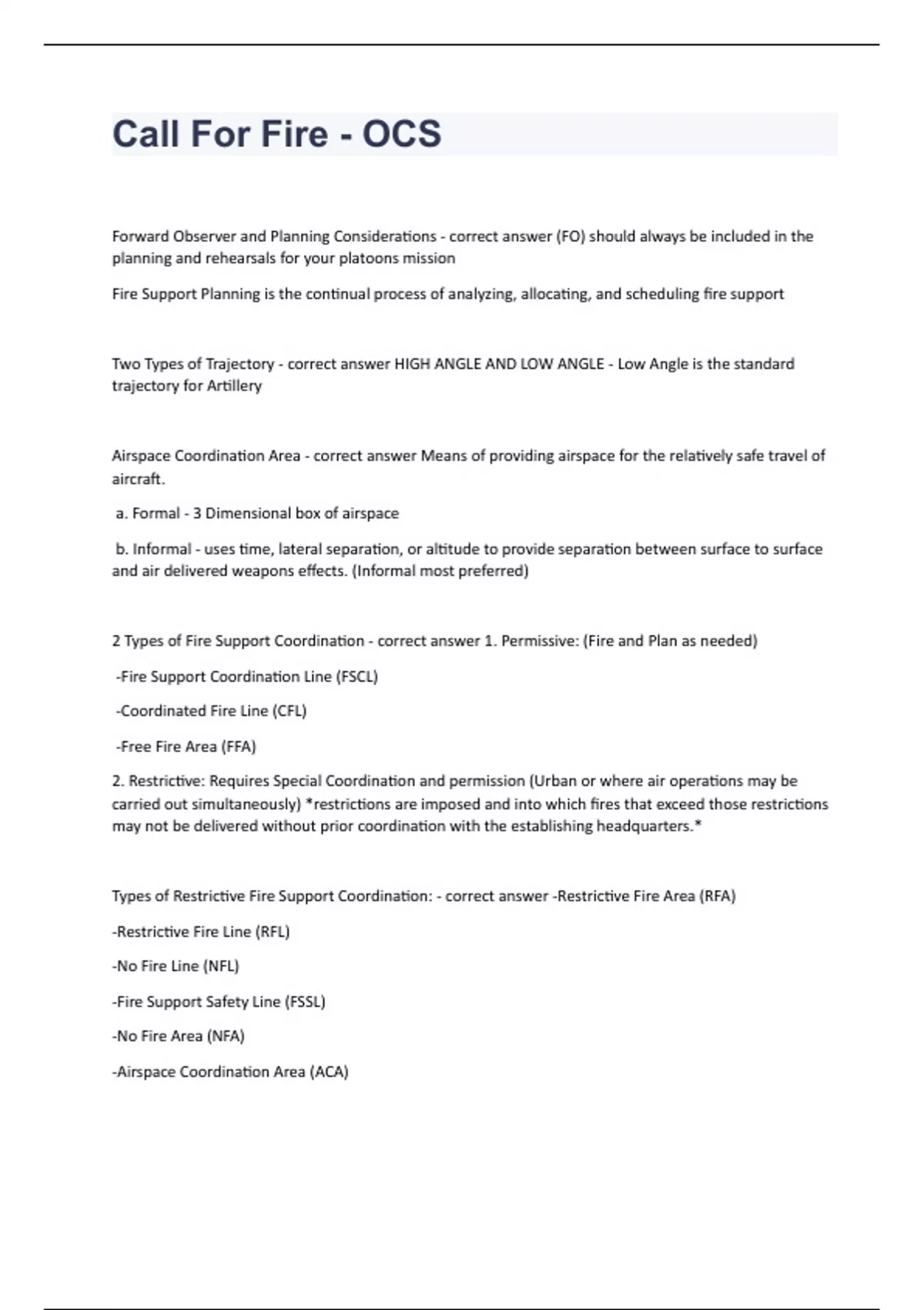 Call For Fire - OCS.Forward Observer and Planning Considerations - correct answer (FO) should always be included in the planning and rehearsals for your platoons mission Fire Support Planning is the continual process of analyzing, allocating, and scheduling fire support Two Types of Trajectory - correct answer HIGH ANGLE AND LOW ANGLE - Low Angle is the standard trajectory for Artillery Airspace Coordination Area - correct answer Means of providing airspace for the relatively safe travel of aircraft. a. Formal - 3 Dimensional box of airspace b. Informal - uses time, lateral separation, or altitude to provide separation between surface to surface and air delivered weapons effects. (Informal most preferred) 2 Types of Fire Support Coordination - correct answer 1. Permissive: (Fire and Plan as needed) -Fire Support Coordination Line (FSCL) -Coordinated Fire Line (CFL) -Free Fire Area (FFA) 2. Restrictive: Requires Special Coordination and permission (Urban or where air operations may be carried out simultaneously) *restrictions are imposed and into which fires that exceed those restrictions may not be delivered without prior coordination with the establishing headquarters.* Types of Restrictive Fire Support Coordination: - correct answer -Restrictive Fire Area (RFA) -Restrictive Fire Line (RFL) -No Fire Line (NFL) -Fire Support Safety Line (FSSL) -No Fire Area (NFA) -Airspace Coordination Area (ACA) No Fire Area (NFA) - correct answer An NFA is an area into which no fires or their effects are allowed. An NFA may be used to protect a national asset, population center, or shrine. Tactical uses of NFA may be to protect forward elements such as OP's and scouts. 2 Exceptions to NFA's - correct answer when the establishing HQ allows fires on a mission-by-mission basis or when a friendly force is engaged by an enemy located within the NFA and the commander returns fire to defend his forces. Targets - correct answer -Source of Targets -Group Target -Planned Target -Target of Opportunity Sources of Targets - correct answer Intelligence Assets, Target Acquisition Assets and Forward Observers. Group Target - correct answer consists of two or more targets on which maneuver commander desires simultaneous attack. Planned Target - correct answer a target against which fires have been prearranged Target of Opportunity - correct answer target that is visible to a surface or air sensor or observer, is within range of available weapons, and against which fire has not been scheduled or requested. Targeting - correct answer Targets should be planned Short of the LD (Line of Departure) from LD to the Objective From Objective and Beyond Uses of Fires - correct answer To Disrupt, To Neutralize, To Block, To Turn, To Canalize, to Suppress, to Harass, etc.