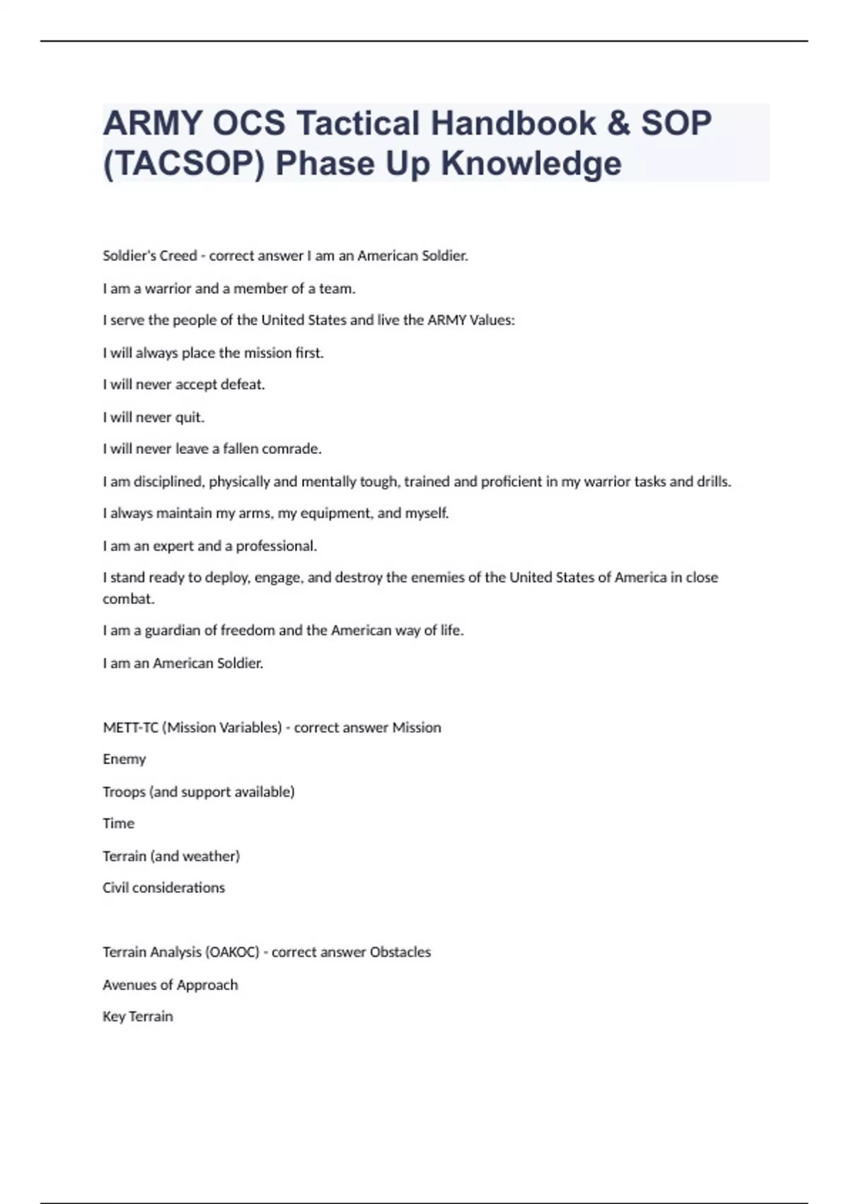 ARMY OCS Tactical Handbook & SOP (TACSOP) Phase Up KnowledgeSoldier's Creed - correct answer I am an American Soldier. I am a warrior and a member of a team. I serve the people of the United States and live the ARMY Values: I will always place the mission first. I will never accept defeat. I will never quit. I will never leave a fallen comrade. I am disciplined, physically and mentally tough, trained and proficient in my warrior tasks and drills. I always maintain my arms, my equipment, and myself. I am an expert and a professional. I stand ready to deploy, engage, and destroy the enemies of the United States of America in close combat. I am a guardian of freedom and the American way of life. I am an American Soldier. METT-TC (Mission Variables) - correct answer Mission Enemy Troops (and support available) Time Terrain (and weather) Civil considerations Terrain Analysis (OAKOC) - correct answer Obstacles Avenues of Approach Key Terrain Observation and Fields of Fire Cover and Concealment Characteristics of the offense - correct answer Surprise Concentration Audacity Tempo MEDEVAC Request - correct answer Line 1: grid coordinates of pickup site Line 2: Requesting unit radio frequency, call sign, and suffix Line 3: Number of patients by precedence (urgent, urgent surgical, priority, routine, convenience) Line 4: Special equipment required (none, hoist, extraction, equipment, ventilator) Line 5: Number of patients by type (# litter and # ambulatory) Line 6: Security of pickup site (war time) Line 7: Number and type of wound, injury, or illness (peacetime) Line 8: Method of marking pick up site Line 9: Patient nationality and status Line 10: CBRN contamination (wartime) Line 11: Terrain description (peacetime) SALUTE Report - correct answer Size: Express as a quantity and echelon or size. Activity: What is happening should be a concise bullet. Location: An 8 or 10 grid coordinate, or an address, if appropriate. Unit: Who os performing the activity? Designate the Unit or identify a group or individual. Time: When the activity was observed, or if ongoing, when it was initiated. Equipment: Describe/Identify any equipment, expand on previous entries. Five Paragraph Operation Order - correct answer Task Organization (1) SITUATION