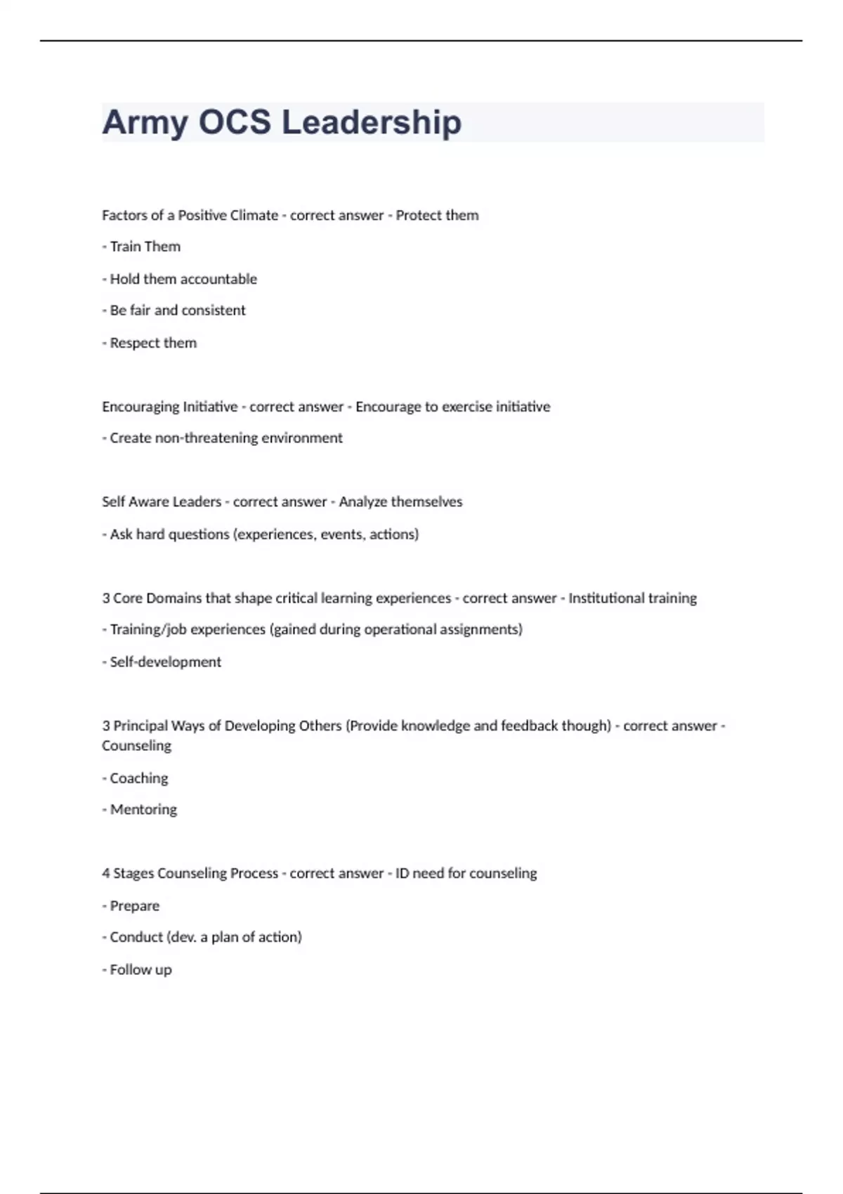 Army OCS LeadershipFactors of a Positive Climate - correct answer - Protect them - Train Them - Hold them accountable - Be fair and consistent - Respect them Encouraging Initiative - correct answer - Encourage to exercise initiative - Create non-threatening environment Self Aware Leaders - correct answer - Analyze themselves - Ask hard questions (experiences, events, actions) 3 Core Domains that shape critical learning experiences - correct answer - Institutional training - Training/job experiences (gained during operational assignments) - Self-development 3 Principal Ways of Developing Others (Provide knowledge and feedback though) - correct answer - Counseling - Coaching - Mentoring 4 Stages Counseling Process - correct answer - ID need for counseling - Prepare - Conduct (dev. a plan of action) - Follow up 3 Types of Developmental Counseling - correct answer - Event Counseling - Performance Counseling - Professional Growth Counseling Event Counseling - correct answer - Covers a specific event/situation - May precede/follow events Performance Counseling - correct answer - Review of a subord. duty performance during a specified period Professional Growth Counseling - correct answer - Developmental orientation (planning for accomplishment of goals) Approaches to Counseling - correct answer - Directive - Nondirective - Combined *Major diff between the 3: degree to which subord. participates during counseling session Directive Approach - correct answer - Simple problems - On-the-spot Corrections - Leader tells subord. what/when to do/it Non-Directive Approach - correct answer - Preferred Method - Leaders use experience, insight, judgement (used to explain counseling process and expectations) Combined Approach - correct answer - Techniques from both directive & non-directive - Emphasizes subord planning & decision-making responsibilities