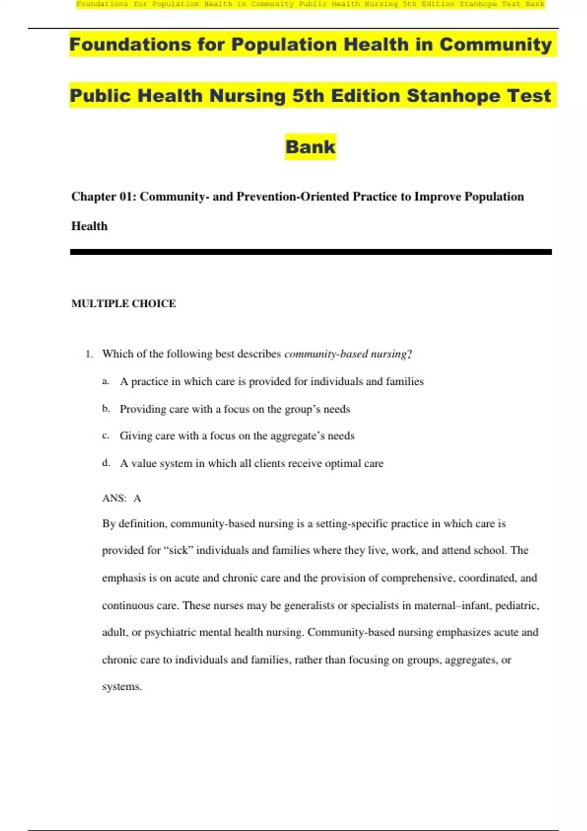 Test Bank for Foundations for Population Health in Community/Public Health Nursing, Stanhope, 5th Edition (Stanhope, 2018) Chapter 1-32 | All Chapters