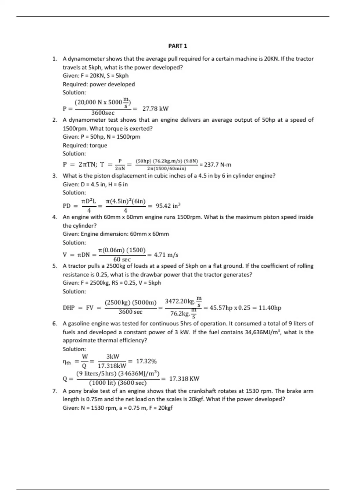 1. A dynamometer shows that the average pull required for a certain machine is 20KN. If the tractor