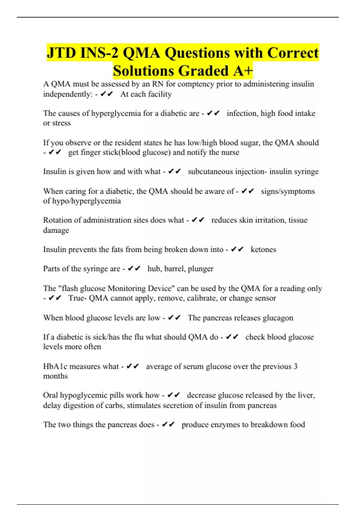A QMA must be assessed by an RN for comptency prior to administering insulin independently: - At each facility The causes of hyperglycemia for a diabetic are - infection, high food intake or stress If you observe or the resident states he has low/high blood sugar, the QMA should - get finger stick(blood glucose) and notify the nurse Insulin is given how and with what - subcutaneous injection- insulin syringe When caring for a diabetic, the QMA should be aware of - signs/symptoms of hypo/hyperglycemia Rotation of administration sites does what - reduces skin irritation, tissue damage Insulin prevents the fats from being broken down into - ketones Parts of the syringe are - hub, barrel, plunger The "flash glucose Monitoring Device" can be used by the QMA for a reading only - True- QMA cannot apply, remove, calibrate, or change sensor When blood glucose levels are low - The pancreas releases glucagon If a diabetic is sick/has the flu what should QMA do - check blood glucose levels more often HbA1c measures what - average of serum glucose over the previous 3 months Oral hypoglycemic pills work how - decrease glucose released by the liver, delay digestion of carbs, stimulates secretion of insulin from pancreas The two things the pancreas does - produce enzymes to breakdown food produce hormones to regulate blood glucose levels Good diabetic management includes - well balanced diet and exercise Can a QMA give U500 insulin - NO Proper storage of insulin includes - Discarding after 28 days Insulin is ordered and measured how - Units